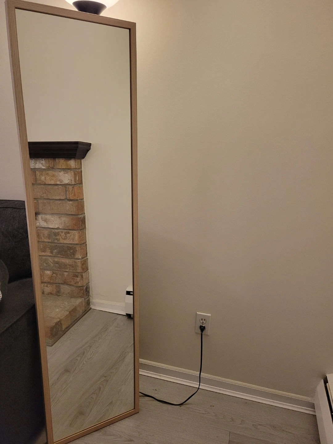 This is a full-length mirror with a clean, light-coloured wooden frame. It's tall and narrow, perfect for checking your outfit. The simple design fits many decors.
