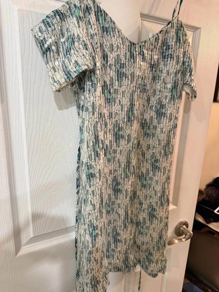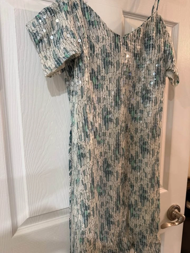 Sparkly French Connection dress. Size 4. Has a cool green and white pattern with little sequins all over. Short sleeves and a crinkled texture. Great for a night out!