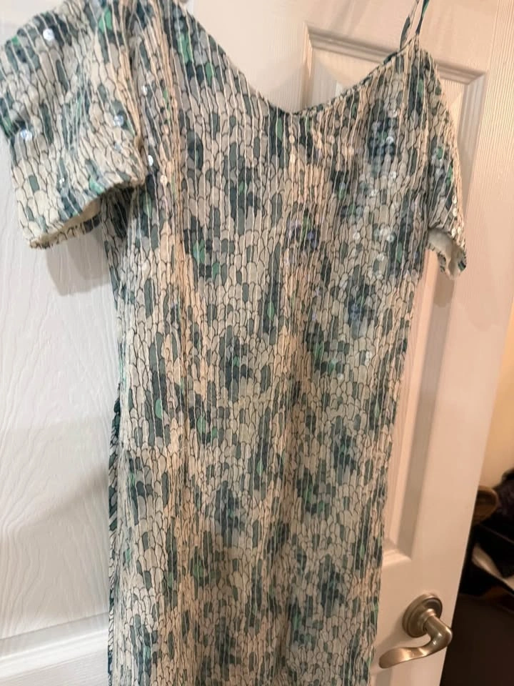 Sparkly French Connection dress. Size 4. Has a cool green and white pattern with little sequins all over. Short sleeves and a crinkled texture. Great for a night out!