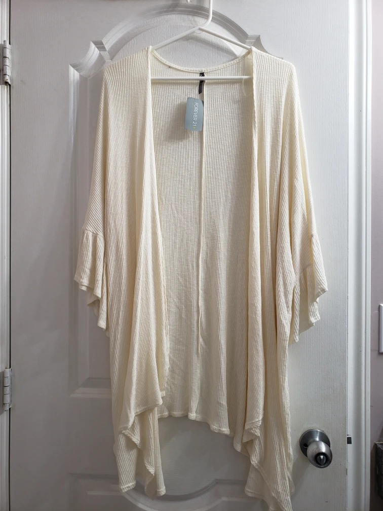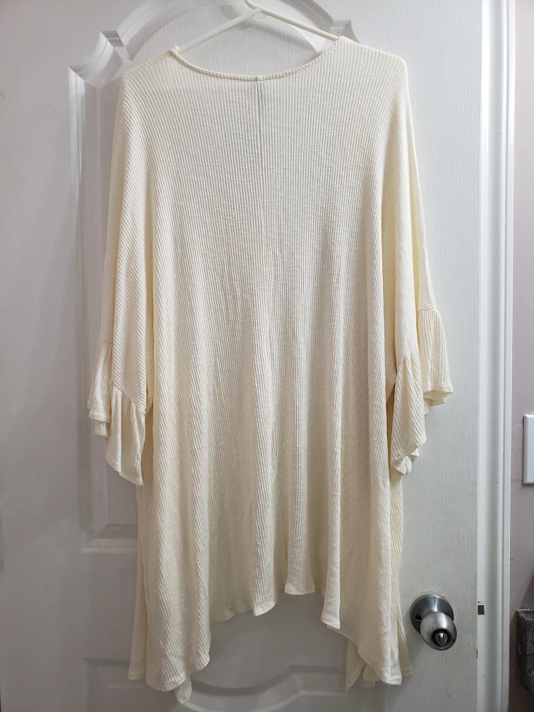 This is a cream knit cardigan with ruffled sleeves. It's a size 2X and made of a comfortable, ribbed material. Great for layering over outfits!
