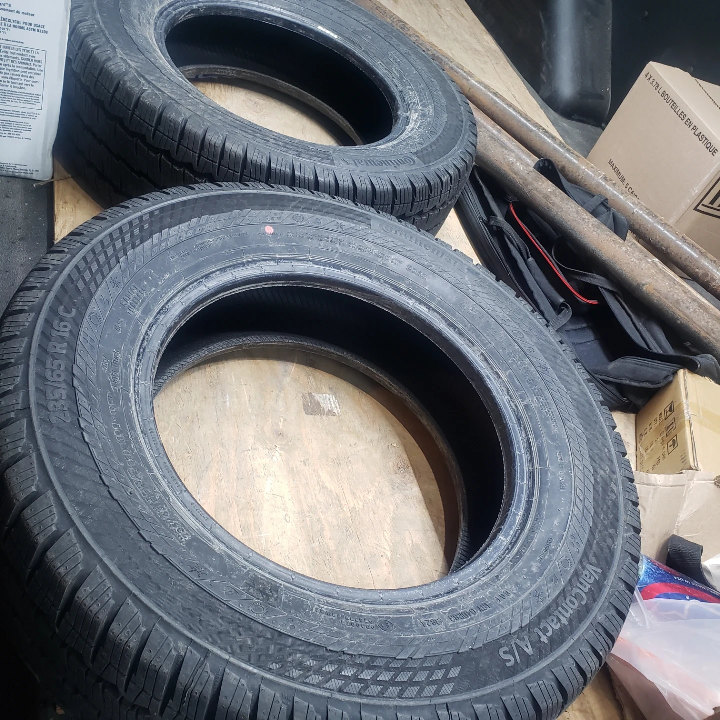 Two Continental VanContact A/S tires. Size is 235/65 R16 C. These are all-season tires suitable for light trucks. $220 for both or best offer.