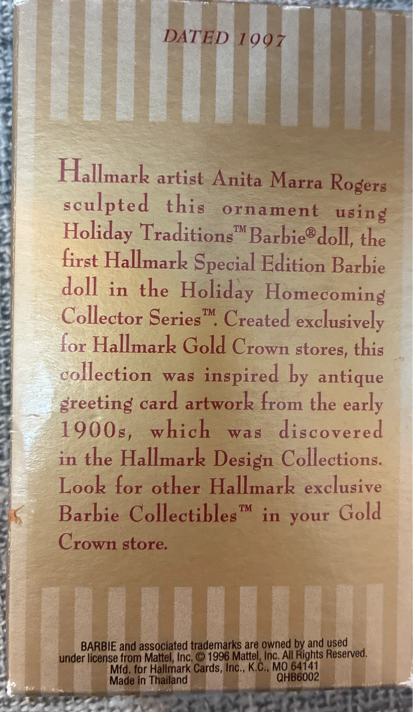 This new Hallmark artist Anita Marra Rogers sculpted ornament is the first Hallmark Special Edition Barbie doll in the Holiday Homecoming Collector Series. It was created exclusively for Hallmark Gold Crown stores and inspired by antique greeting card artwork from the early 1900s. Look for other Hallmark exclusive Barbie Collectibles in your Gold Crown store!
