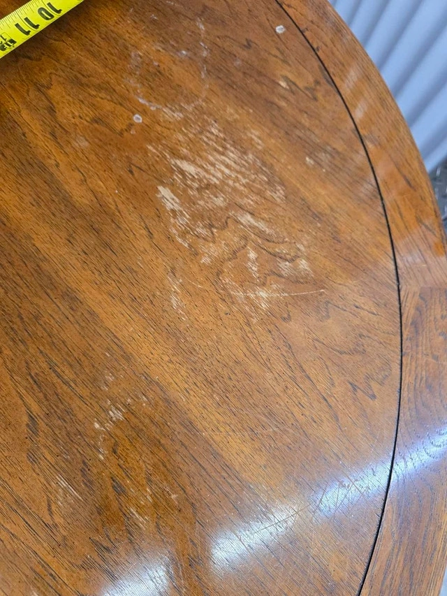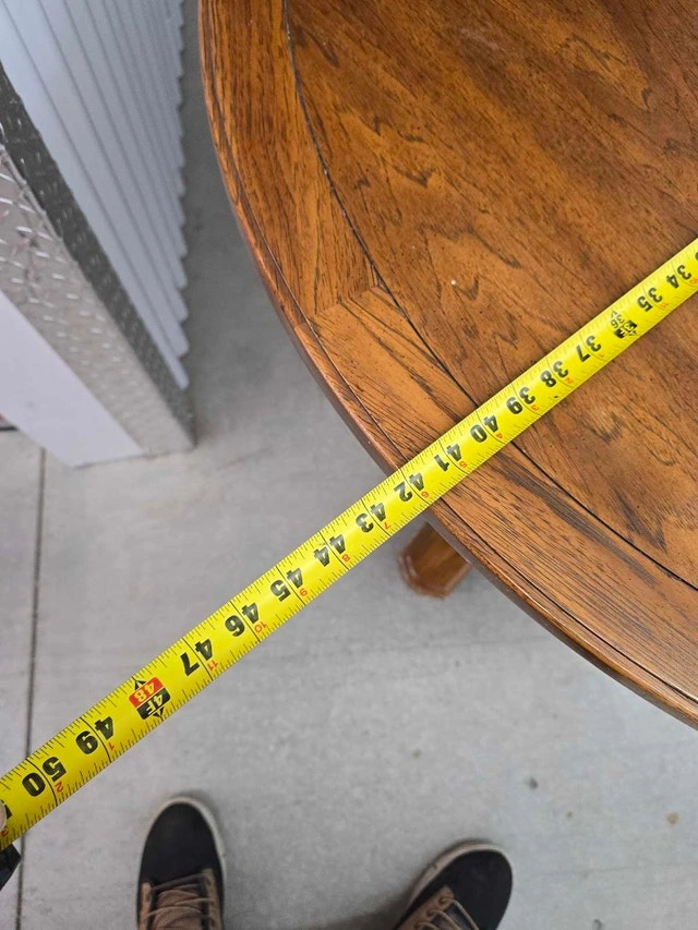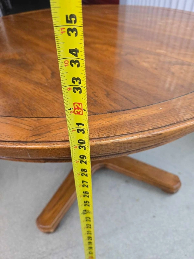 This is a round table with a sturdy pedestal base, perfect for adding a touch of classic charm to any room. The table exhibits signs of wear on the top surface, as highlighted in the photos. Despite its imperfections, it remains a functional and stylish piece. Two 16 inch leaves are included. Approximate Dimensions: Diameter: 50 inches, Height: 32 inches. If this ad is still up, the table is still available!