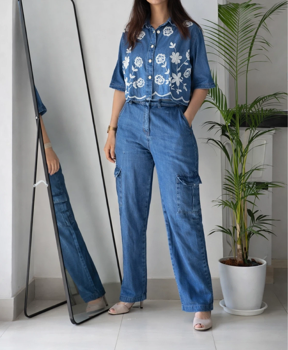Embroidered denim cropped shirt with white floral detailing. It's a stylish, short-sleeved button-up. Perfect for adding a touch of vintage flair to your wardrobe!