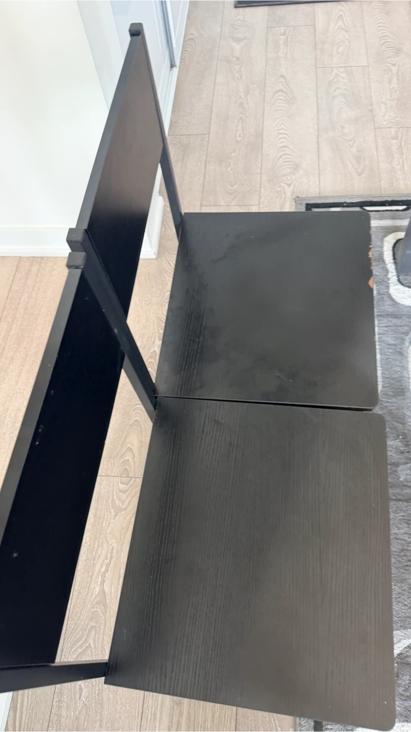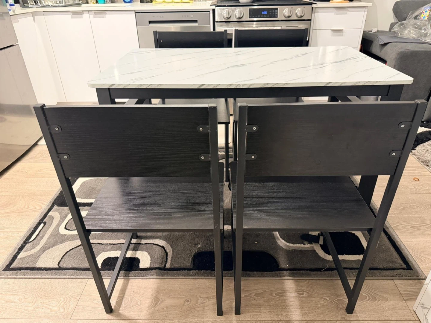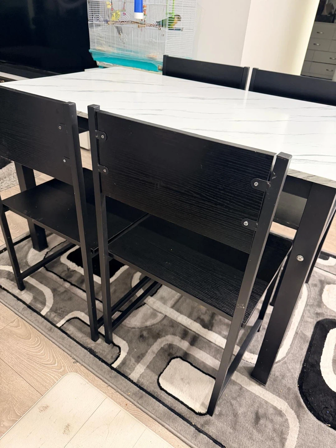 Four-piece dining set featuring a white marble-look tabletop and four black wooden chairs. This set's compact design is suitable for smaller dining areas. Chairs are made of black wood and have a simple, modern silhouette.