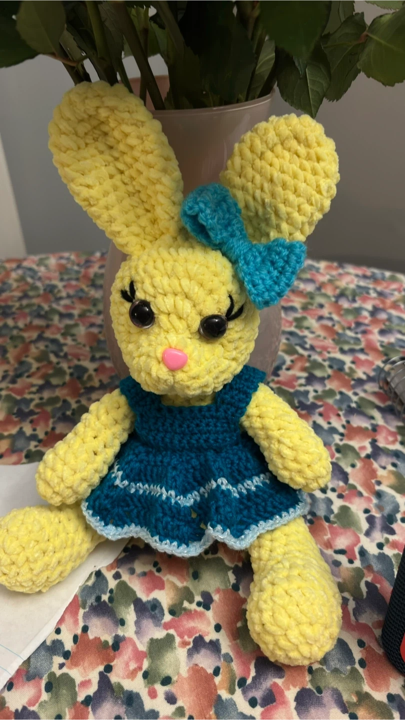 This is a cute, handmade crochet bunny plush toy. It's made from soft, yellow yarn and features a little blue bow. It would make a sweet gift for anyone who loves bunnies!