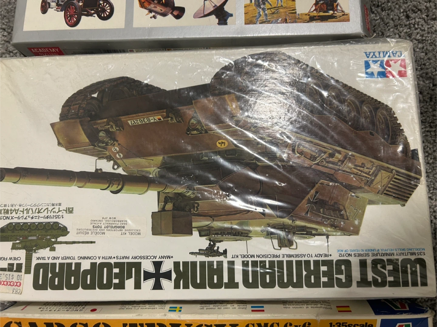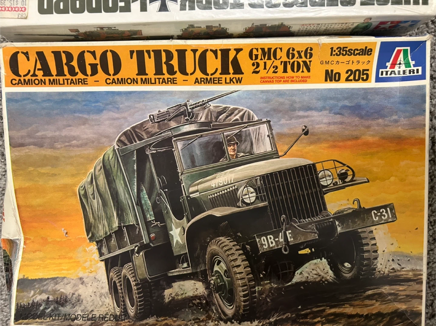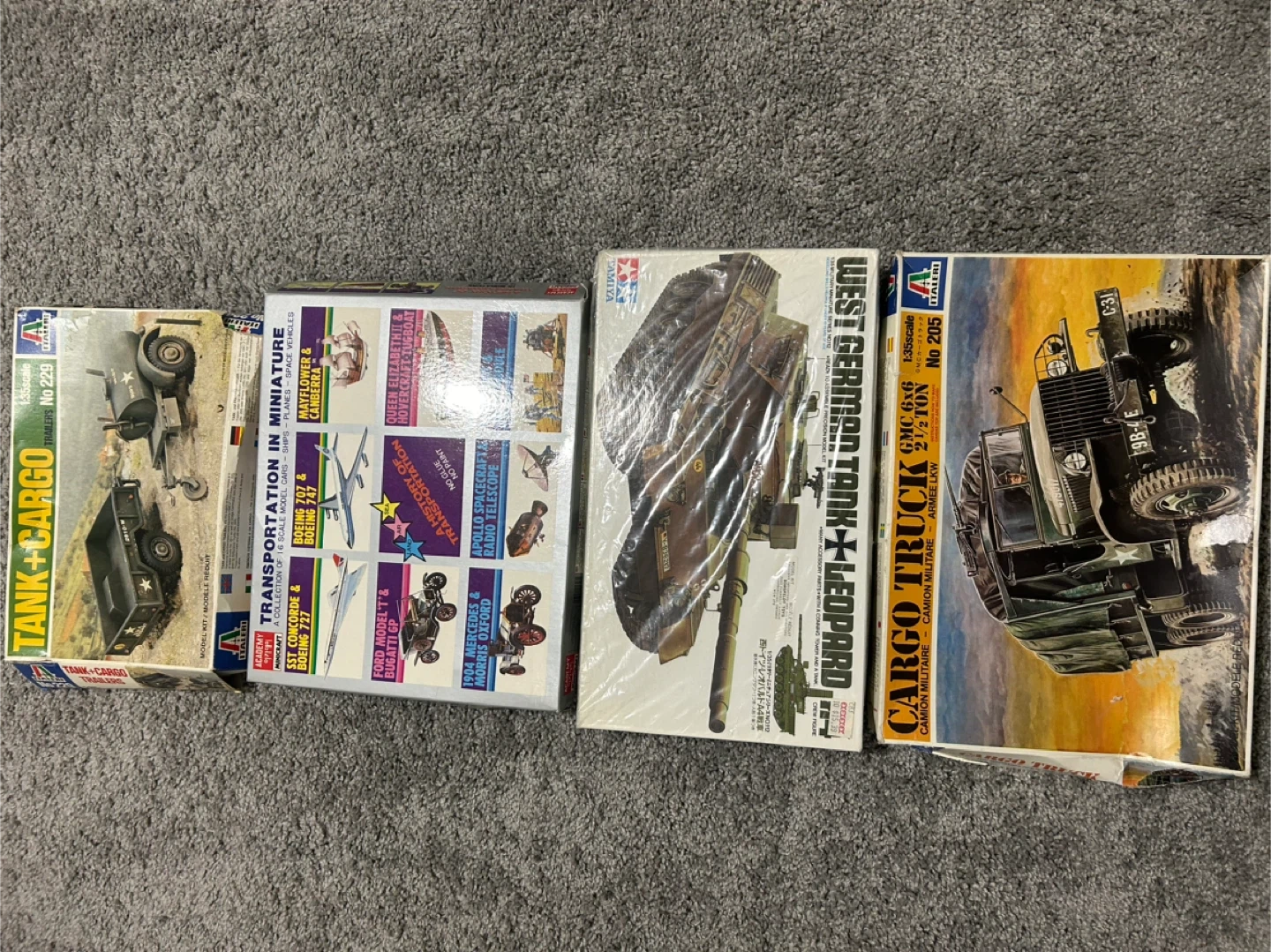 Selling an Italeri Cargo Truck GMC 6x6 2 1/2 Ton 1:35 scale model kit. It is No 205. Also includes Tank + Cargo Trailers No 229 and Academy Minicarft Transportation in Miniature model kit. West Germany tank. Vintage toys come in original boxes 10 for all of them