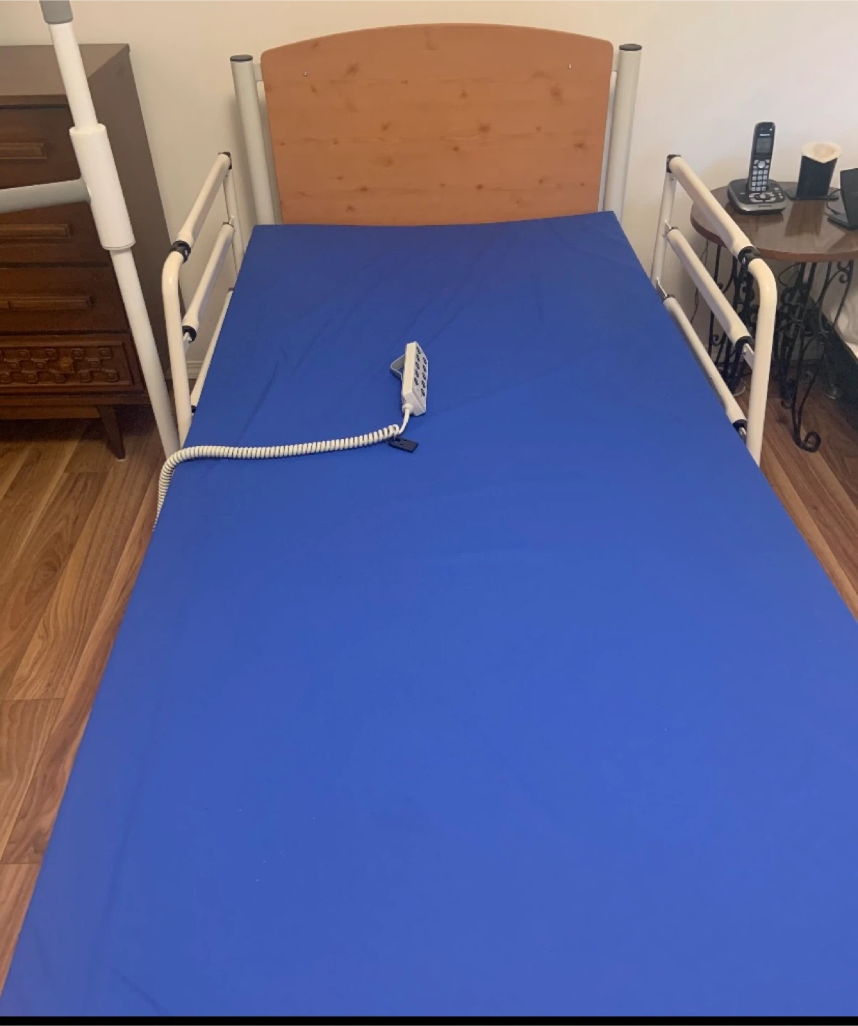 This is a Blake Medical Distribution "Infusion" hospital bed. It's designed with a gel-infused foam surface for comfort. The bed features an adjustable frame with wheels for easy mobility.