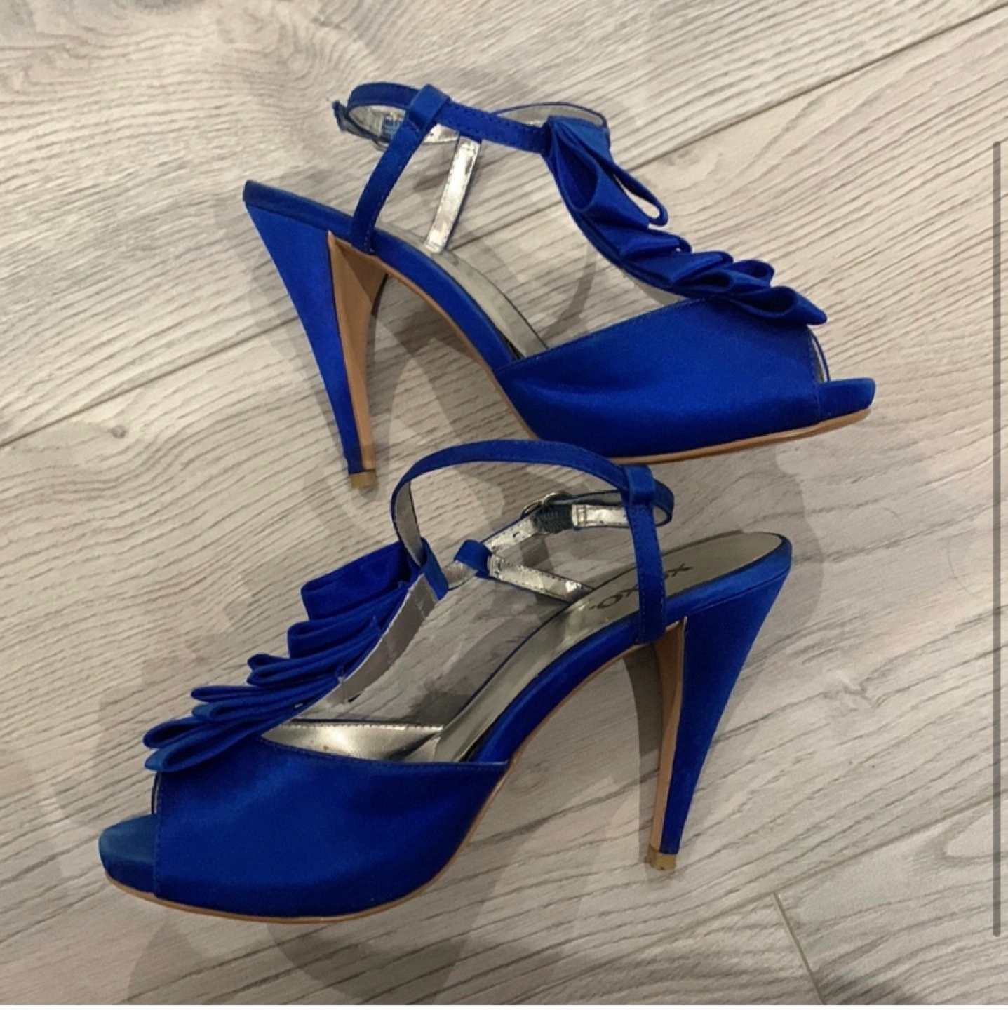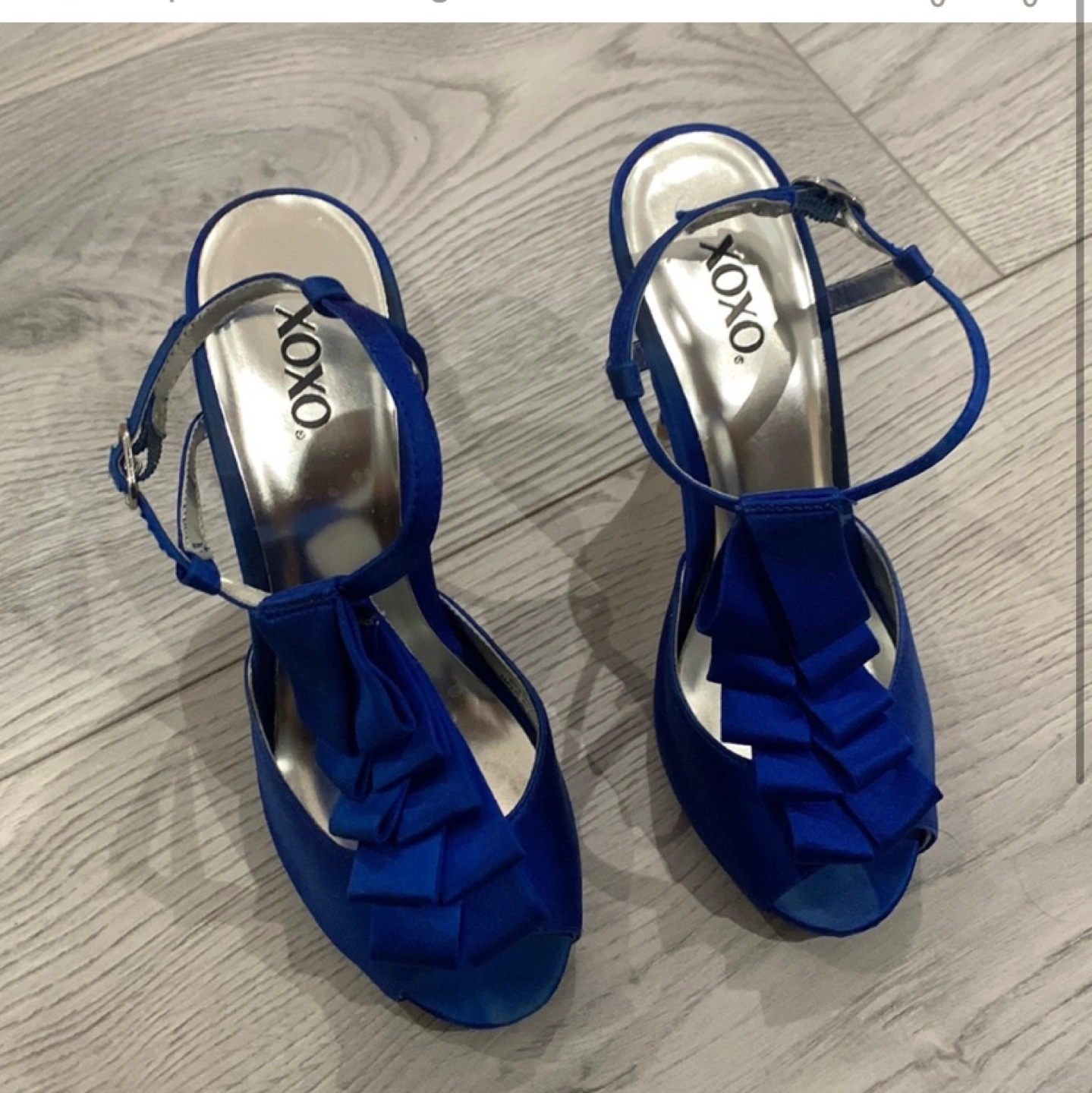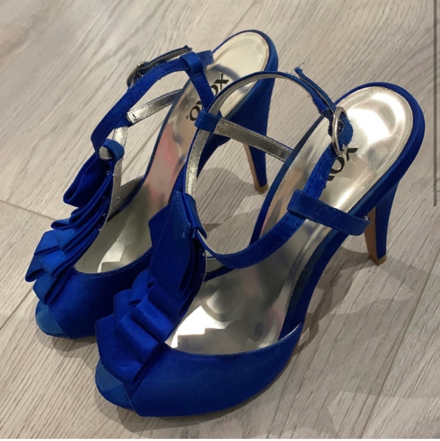 These are beautiful blue heels that are perfect for a special occasion. They feature a delicate ruffle detail and a high heel.