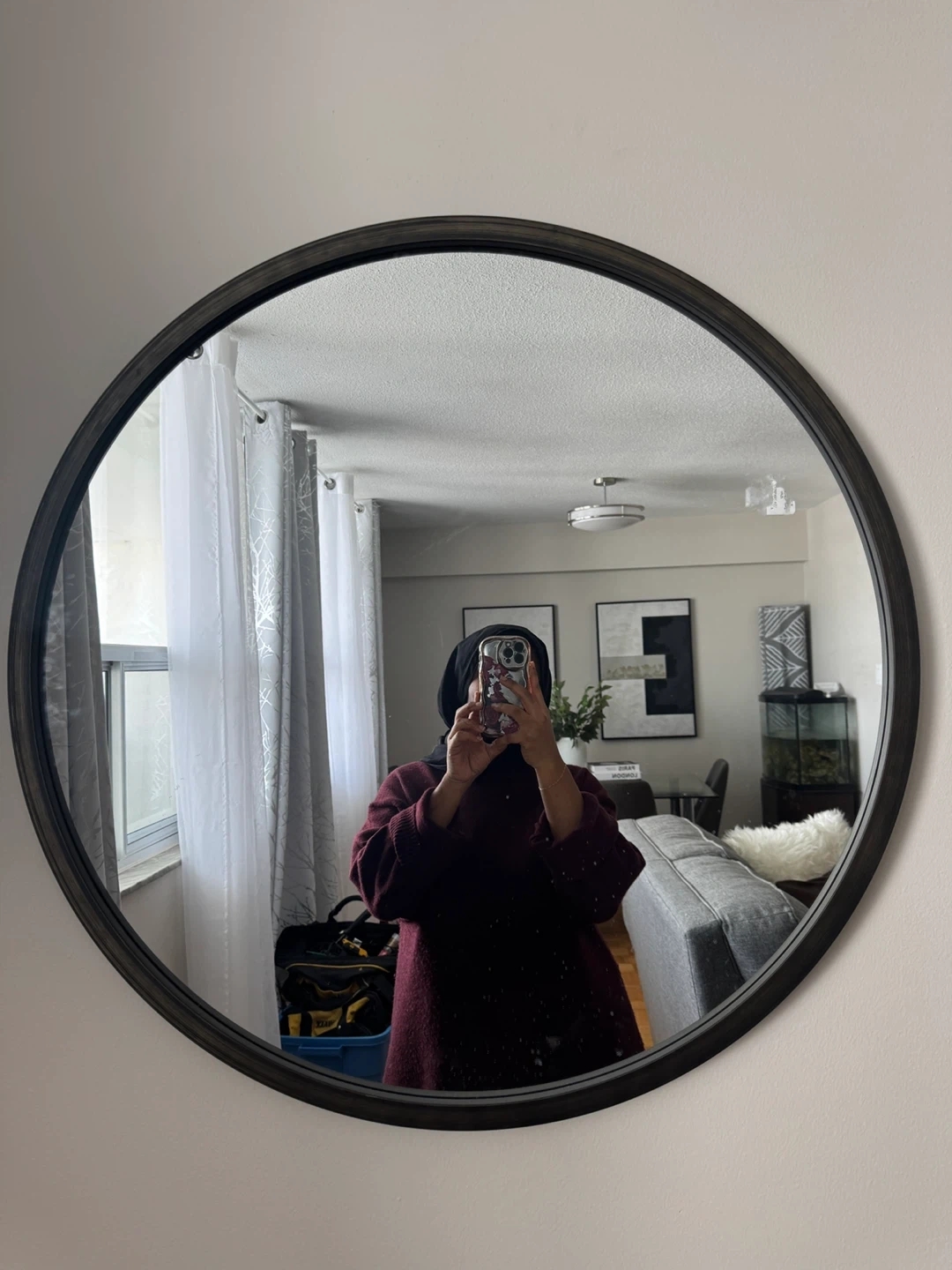 A circular wall mirror with a dark, distressed-look frame. It's a great size for an entryway or living room. The frame appears to be metal or a dark wood composite.