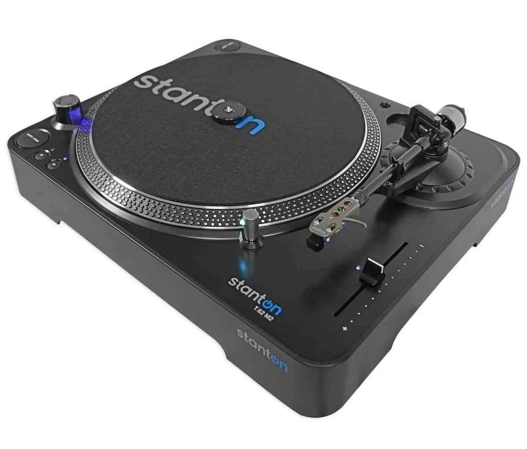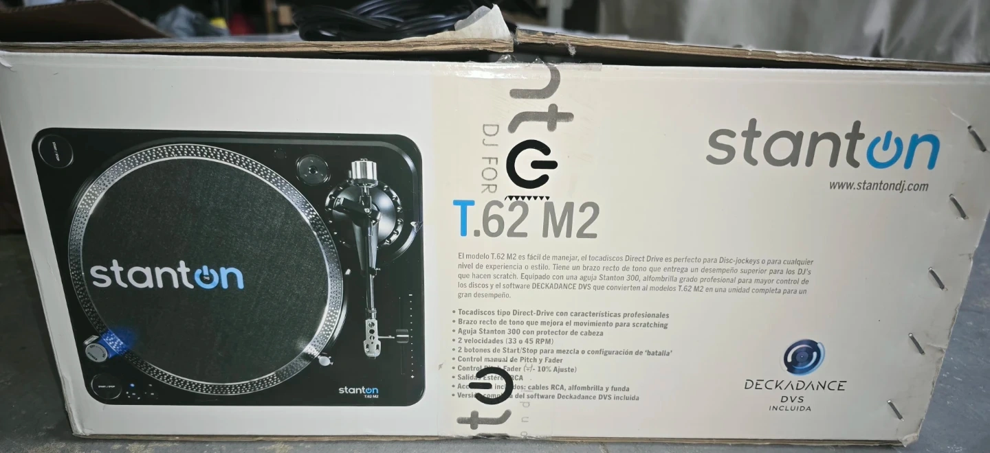 Stanton T.62 M2 Direct Drive DJ turntable with original box and power adapter includes speaker RCA cables. It's a professional model equipped for scratching. It includes RCA cables and the Deckadance DVS software.