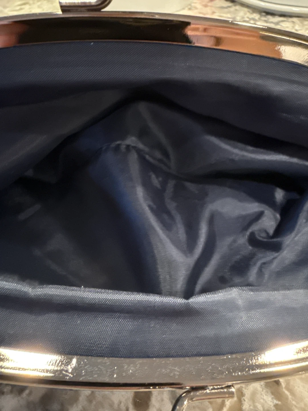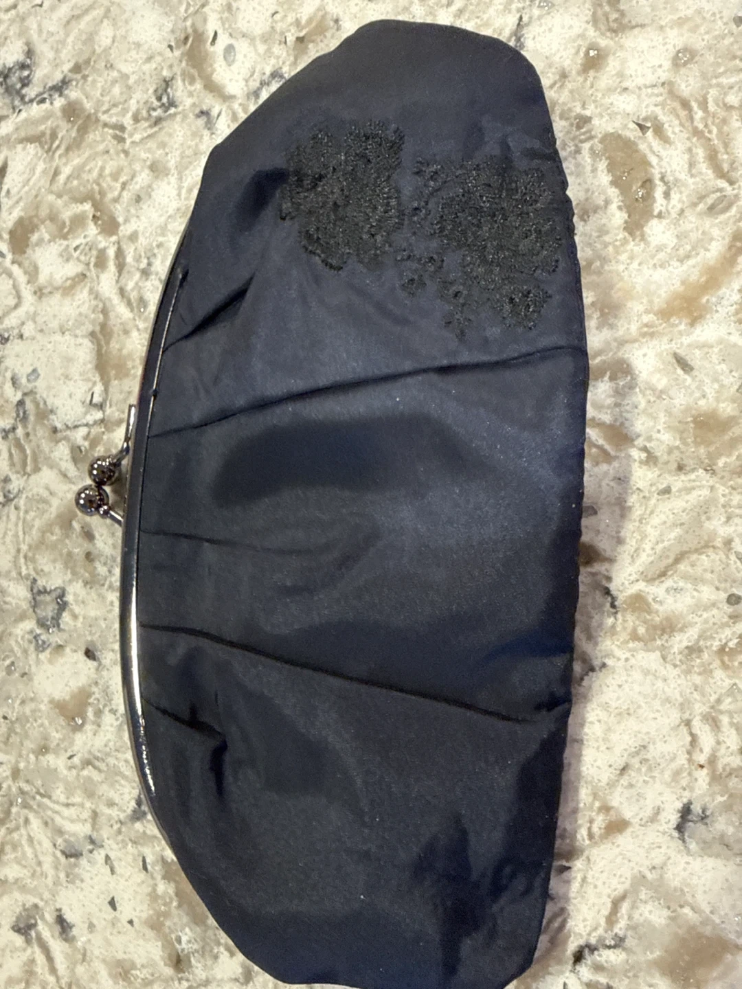 This black clutch bag has a satin-like exterior with elegant ruched detailing. It features a kiss-lock closure and a decorative beaded embroidery design on the front. The interior is lined with dark fabric. It's a stylish accessory for special occasions!