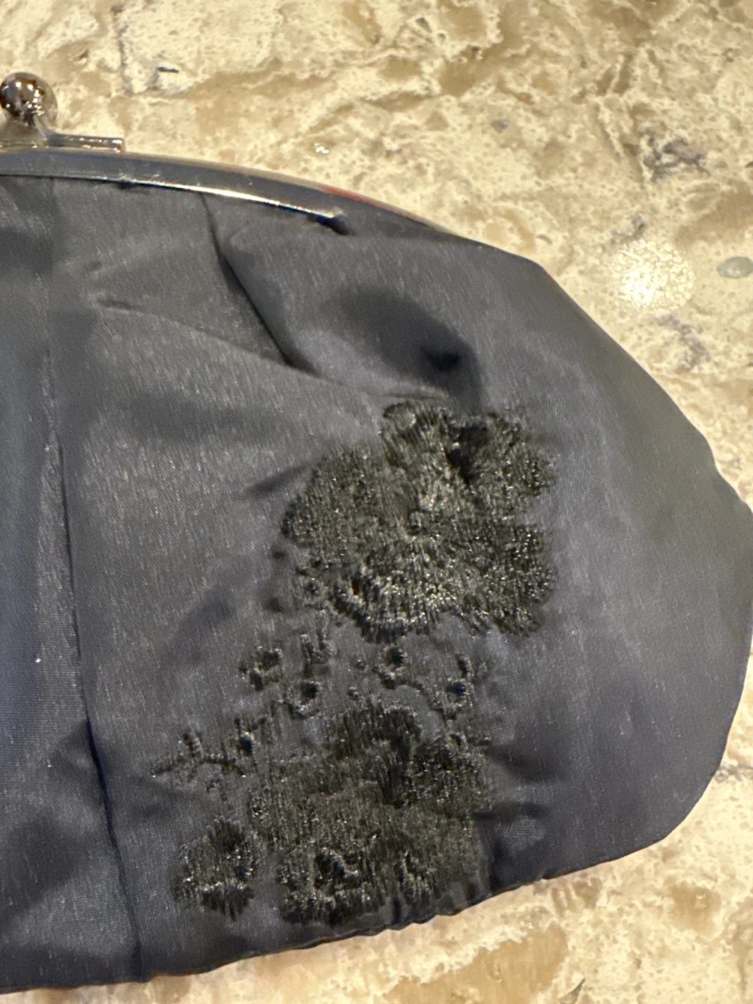 This black clutch bag has a satin-like exterior with elegant ruched detailing. It features a kiss-lock closure and a decorative beaded embroidery design on the front. The interior is lined with dark fabric. It's a stylish accessory for special occasions!