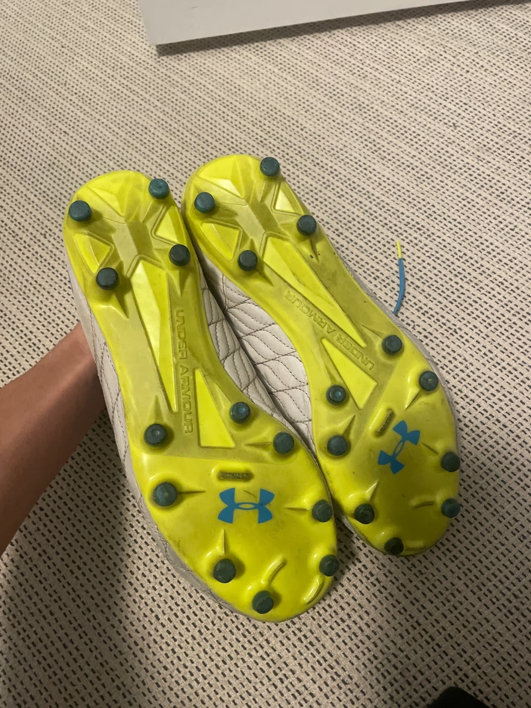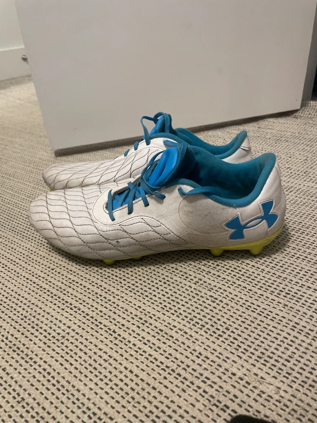 White Under Armour soccer cleats with blue accents. These cleats are a men's size 9 and have a durable outsole for traction on the field. They're ready for your next game!