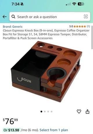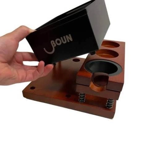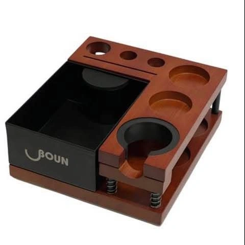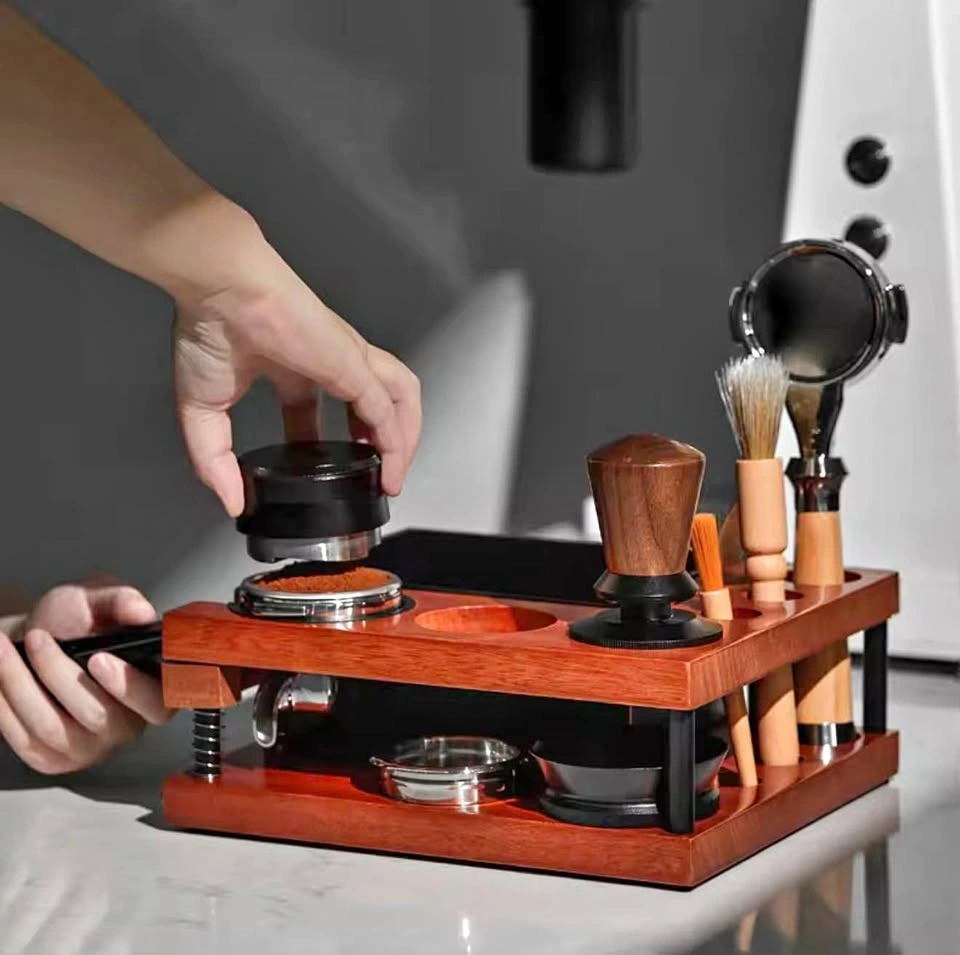 All-in-one organizer: Keeps your tamper, distributor, knock box, and filters neatly stored while prepping espresso shots. Made of sturdy wood with a spring-loaded portafilter holder that securely accommodates all standard sizes. The built-in knock box catches grinds from pulled shots to minimize mess and clean-up time. Simple design allows for quick access to tools and can be easily wiped down to maintain its finish. Fits portafilters from most popular espresso machine brands, including Breville.