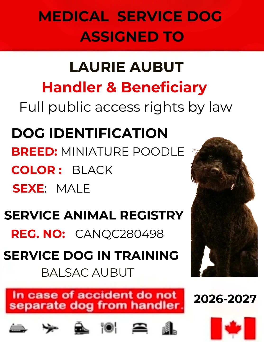 Carte d'identité pour chien d'assistance médicale. Indique le nom du chien, la race (Caniche miniature), le sexe (mâle), le numéro d'enregistrement et le nom du gestionnaire. Autorisation d'accès public incluse par la loi.