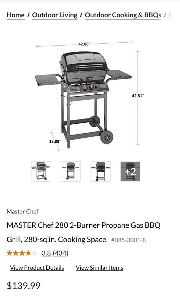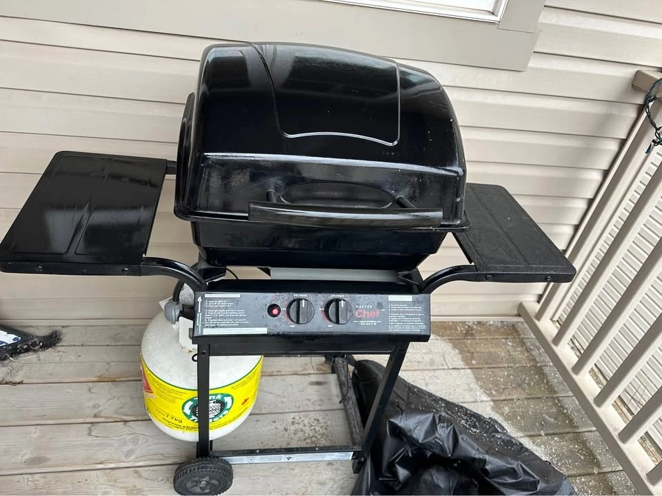 Handy Master Chef 280 2-burner propane BBQ grill with 280 sq.in. cooking space. Comes with side tables. Grill measures about 42.88 inches wide, 42.81 inches high, and 18.88 inches deep. FULL Propane tank included and only used twice last summer.