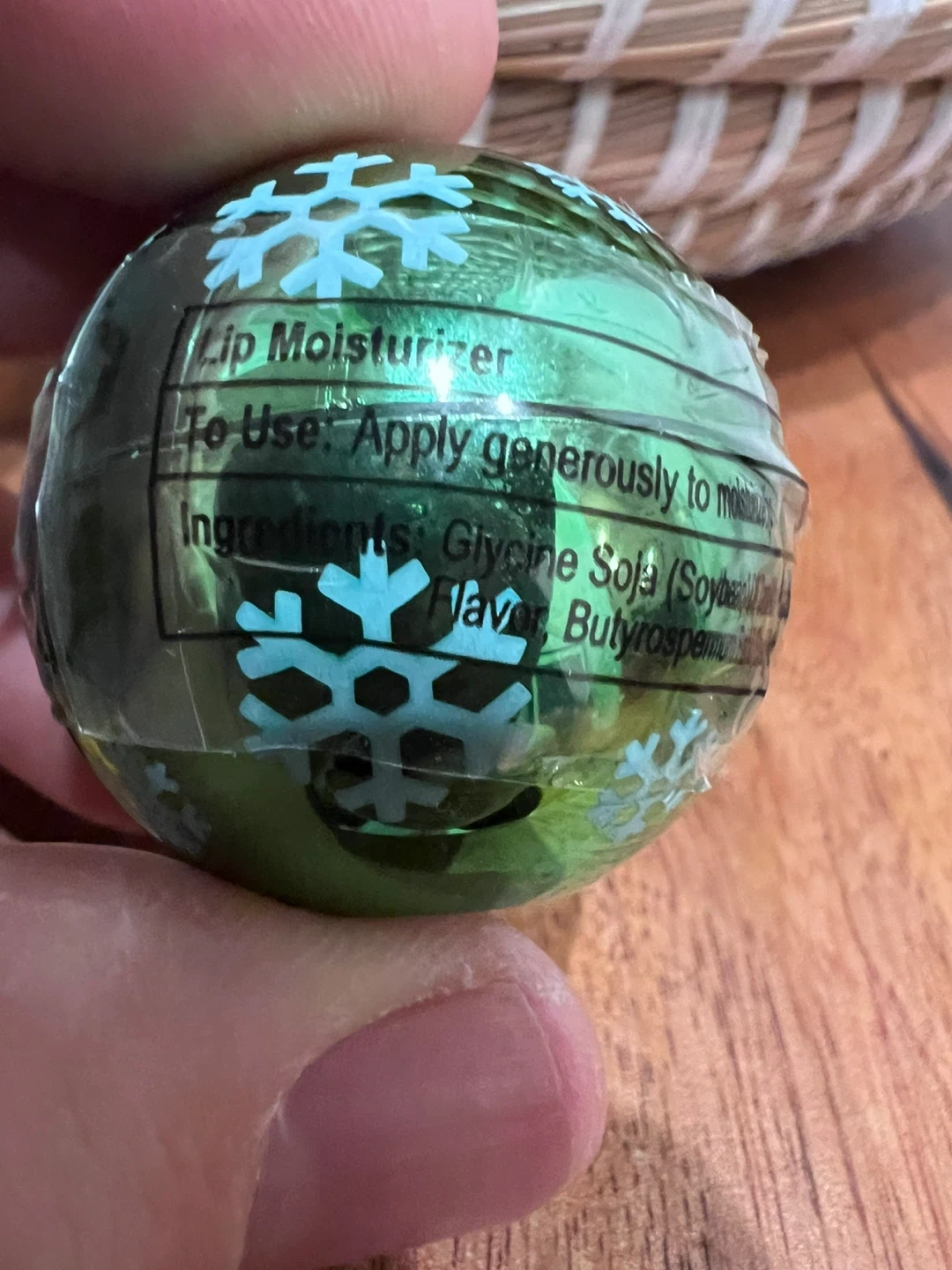 NJ Transit Holiday Lip moisturizer with snowflakes design and NJ Transit logo. Contains lip moisturizer with Glycine Soja (Soybean) and Butyrospermum Parkii (Shea Butter) ingredients.
