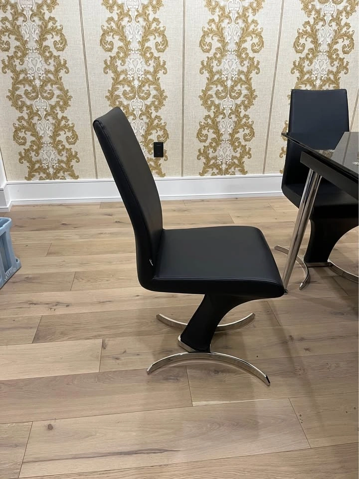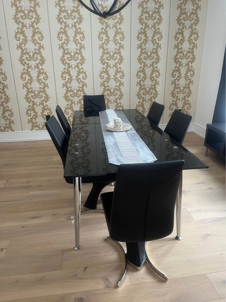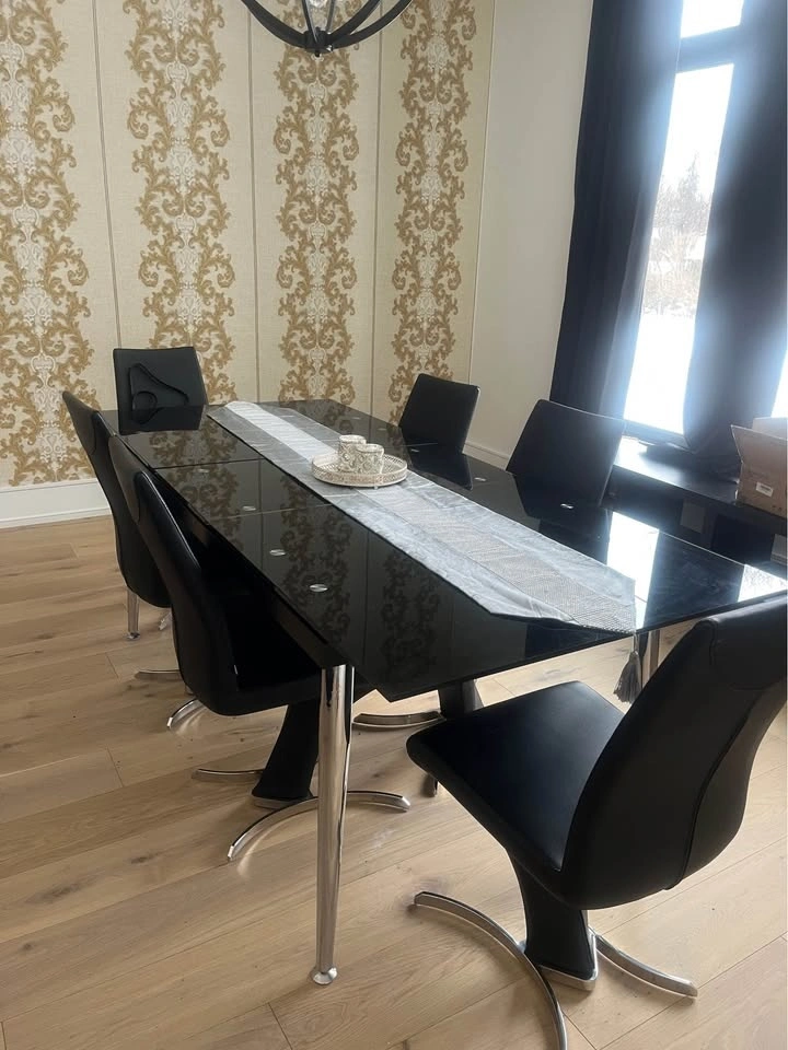 Luxury black glass Italian dining table, extendable for hosting family and friends, paired with 6 brand-new leather chairs. Bought for €4000