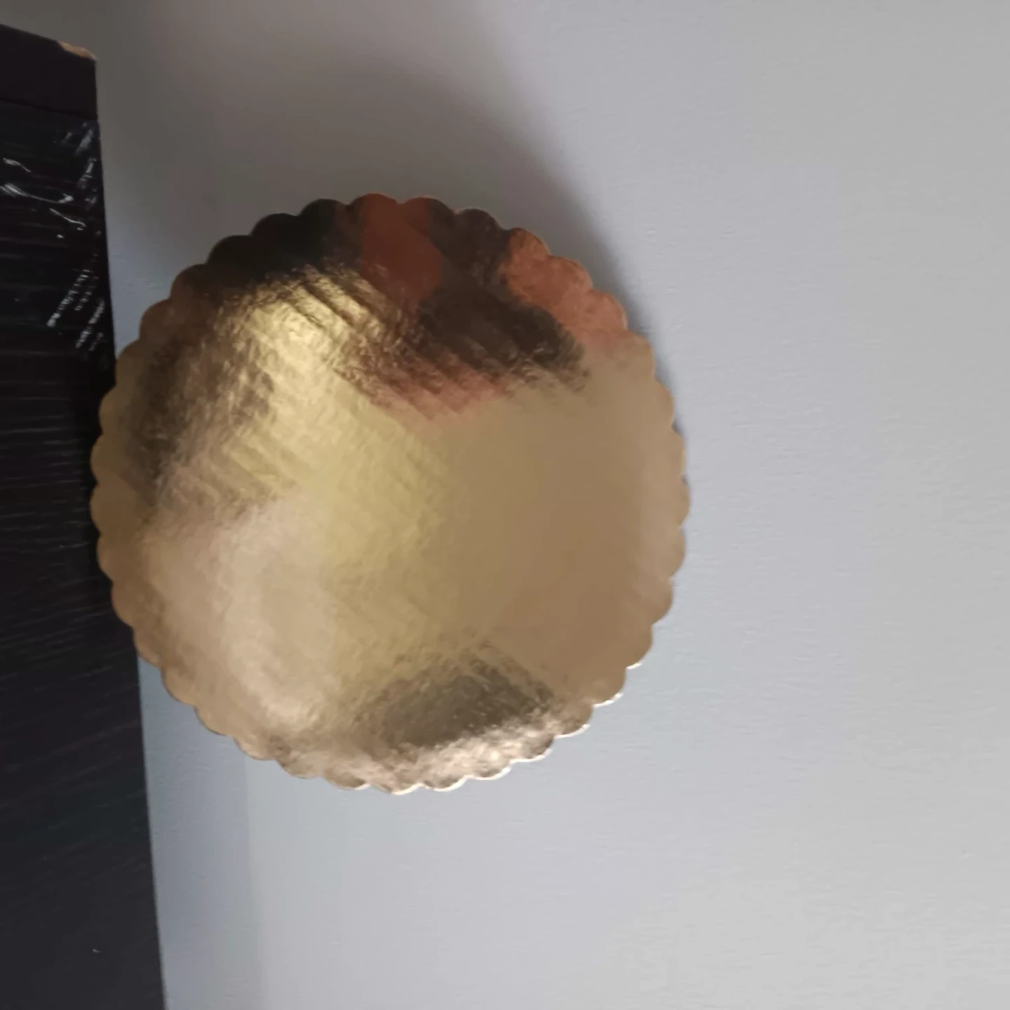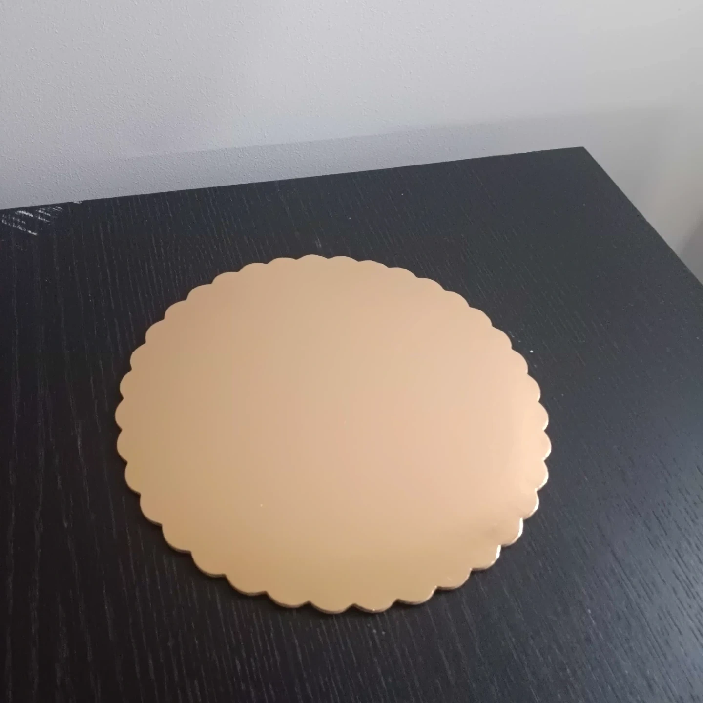 This is a gold cake board with a scalloped edge. It's round and made of cardboard. Great for presenting cakes!