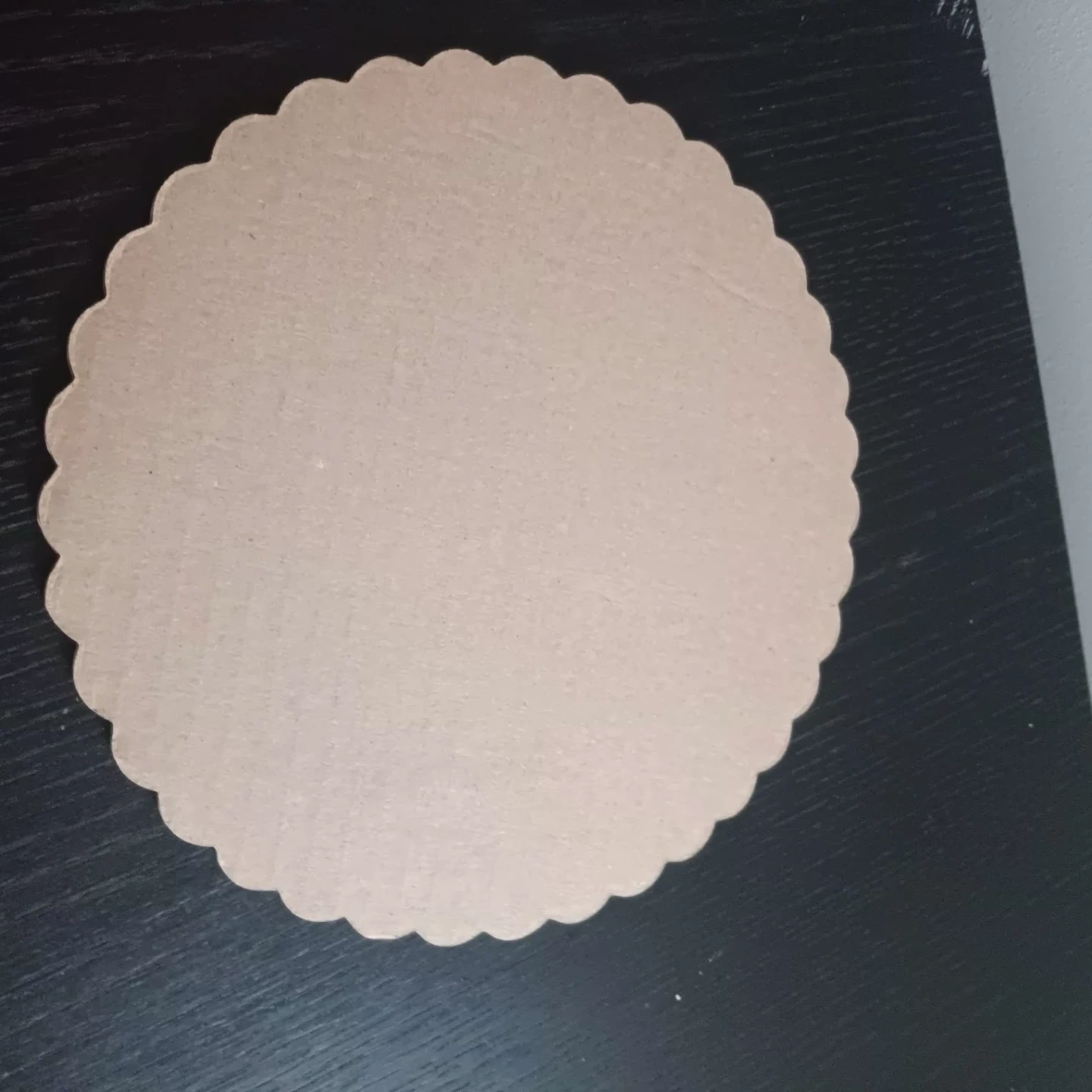 This is a gold cake board with a scalloped edge. It's round and made of cardboard. Great for presenting cakes!