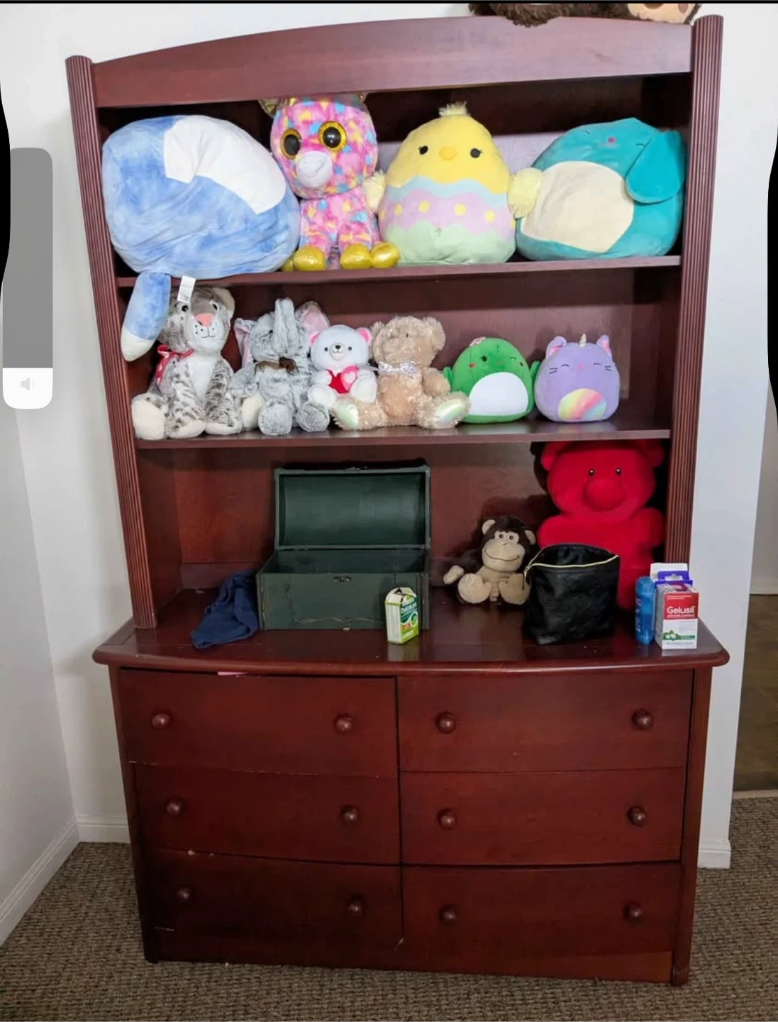 This cherry wood dresser features a hutch with multiple shelves and six drawers for ample storage. It's perfect for organizing clothes and displaying collectibles. The hutch includes a vintage-style green box and several plush toys, adding a playful touch to the furniture.