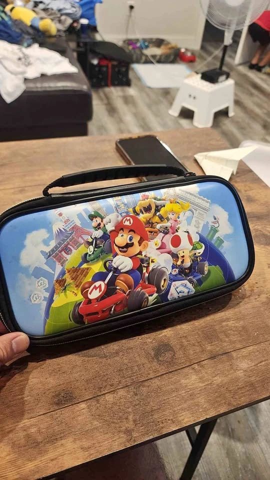 Mario Kart Nintendo Switch case includes two game holders (holds total 8 games) and a stand to hold the Switch upright.
