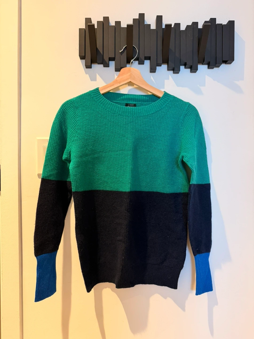 Cozy J.Crew sweater made from 100% cashmere! It's a size small and features a lovely colour block design in green, black, and blue. Perfect for staying warm and stylish this season