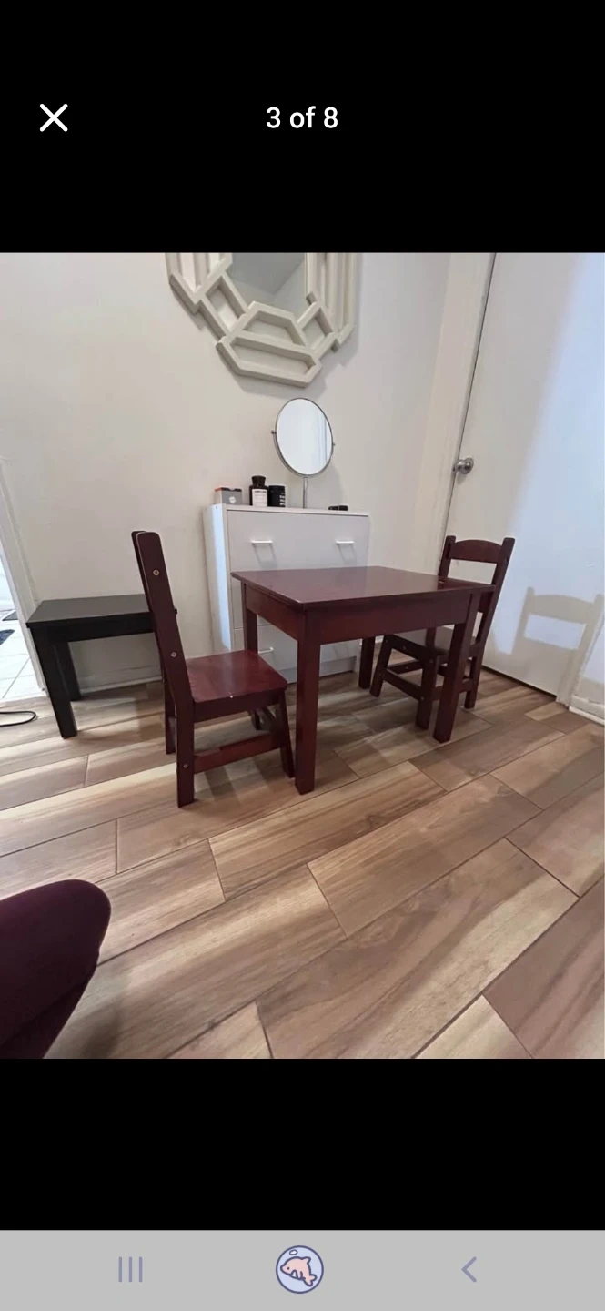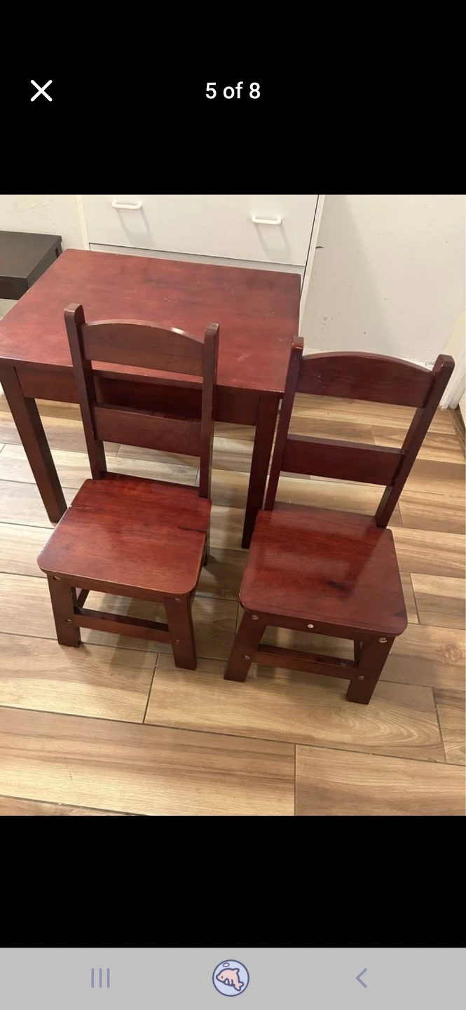 A classic wooden table and chairs set for kids. This set features a rich mahogany finish. It's suitable for arts and crafts or snack time for little ones.