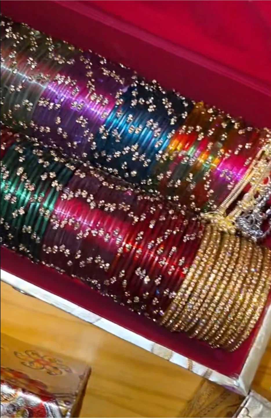 A lovely set of assorted glass bangles, decorated with sparkling stones. Comes in a variety of vibrant colours including red, green, blue, and purple, along with gold bangles. Perfect for adding a festive touch to any outfit!