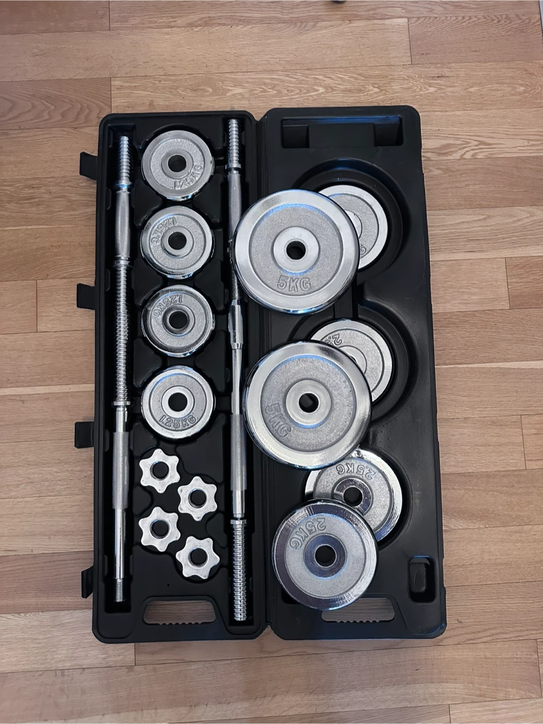 This adjustable dumbbell set includes weight plates, barbells, and collars, all stored in a durable carrying case. Plates are marked with their weights, including 5kg and 25kg. It's great for home workouts and strength training.