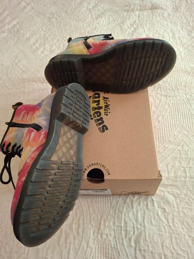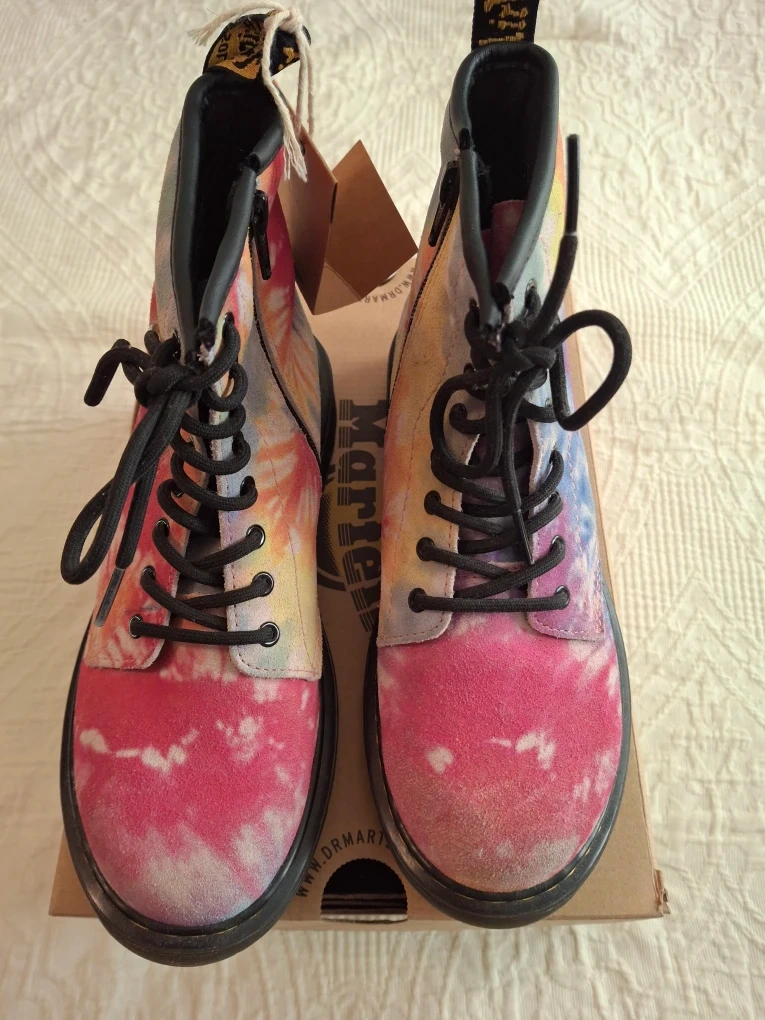 These Dr. Martens 1460 J boots are in good condition (slightly scuffed at tip-'see pic) and come with the original box! They feature a vibrant multi-coloured tie-dye design, perfect for adding a pop of fun to any outfit. The size is US 5 for kids.