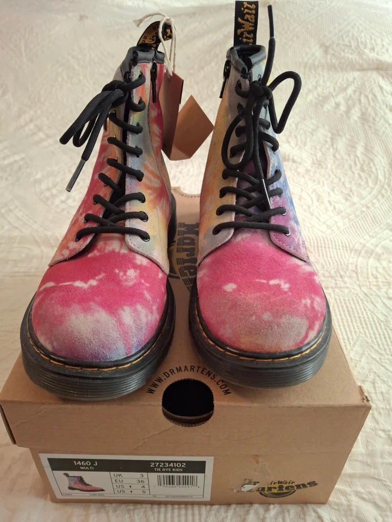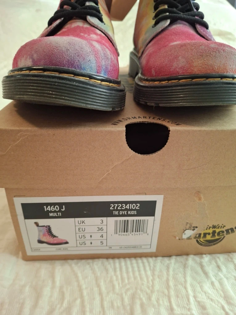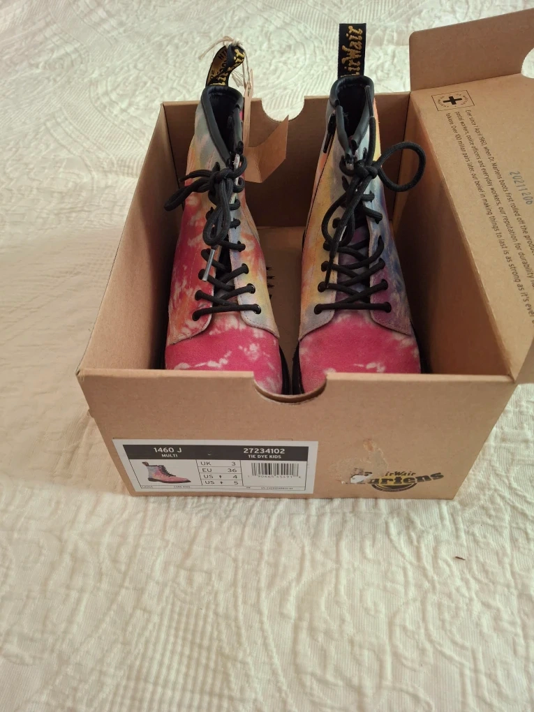 These Dr. Martens 1460 J boots are in good condition (slightly scuffed at tip-'see pic) and come with the original box! They feature a vibrant multi-coloured tie-dye design, perfect for adding a pop of fun to any outfit. The size is US 5 for kids.