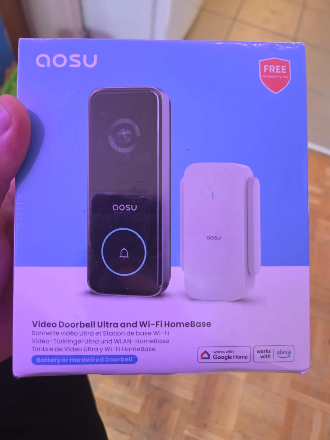 This is the Aosu Video Doorbell Ultra with its Wi-Fi HomeBase. It's a battery or hardwired doorbell. It works with Google Home and Alexa. No monthly fee is required!