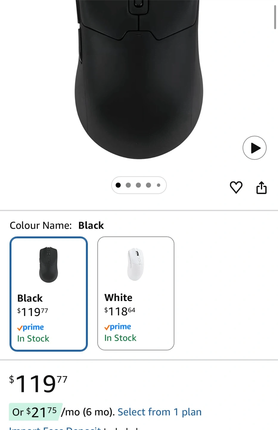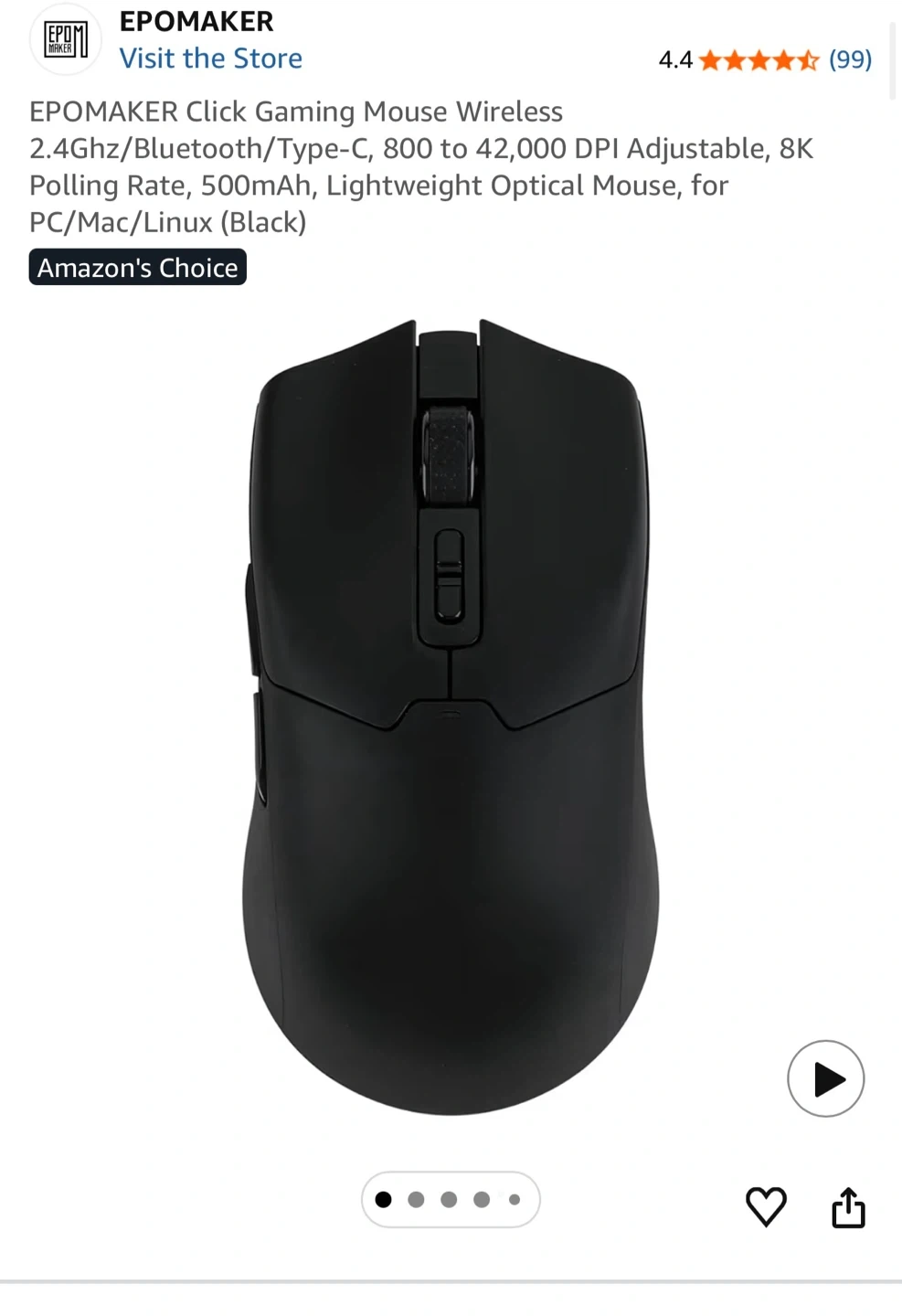 This is the EPOMAKER Click wireless gaming mouse. It's black and connects via 2.4Ghz. The mouse offers adjustable DPI up to 42,000. It has an 8K polling rate and a 500mAh battery.