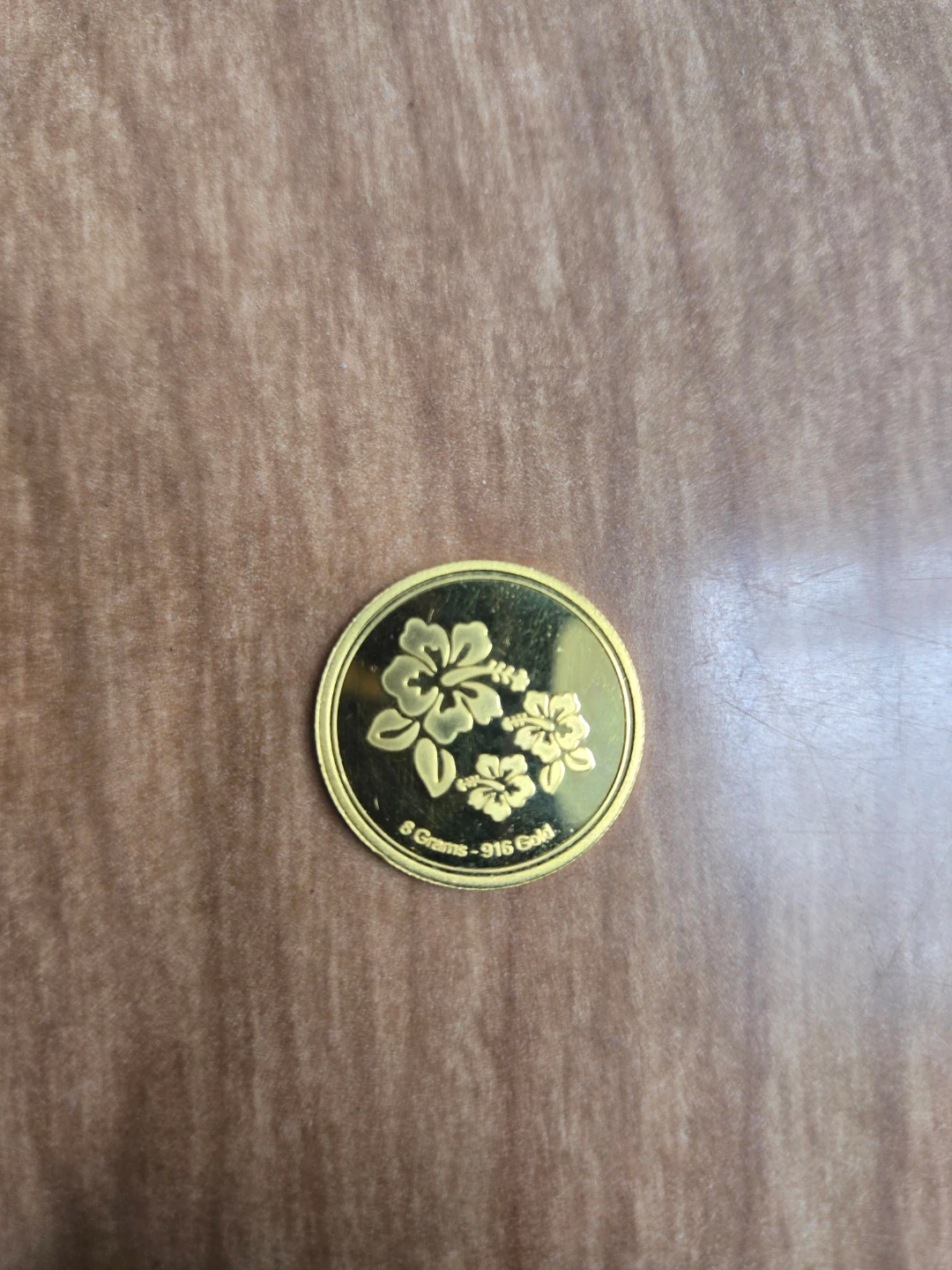 This is a solid gold coin weighing 8 grams with a purity of 916 gold. It features a decorative floral design on one side and a stylized "M" logo on the other. A lovely piece for collectors or as a special gift!