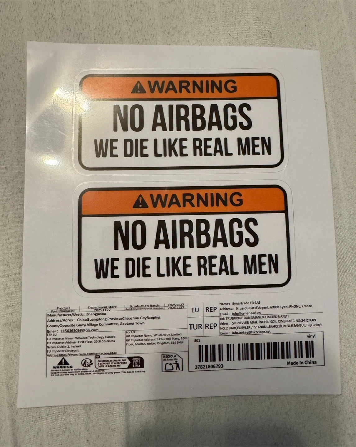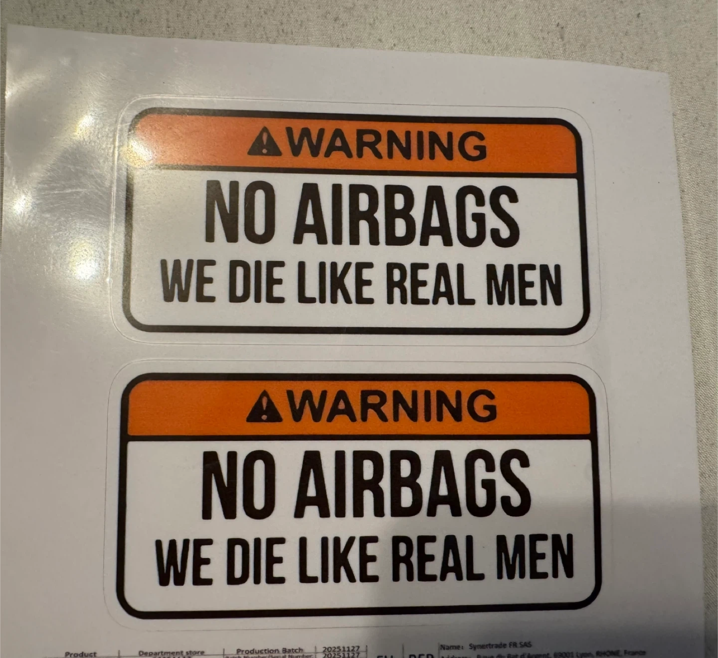 No Airbags We Die Like Real Men – Funny Car Sticker 2 Pack