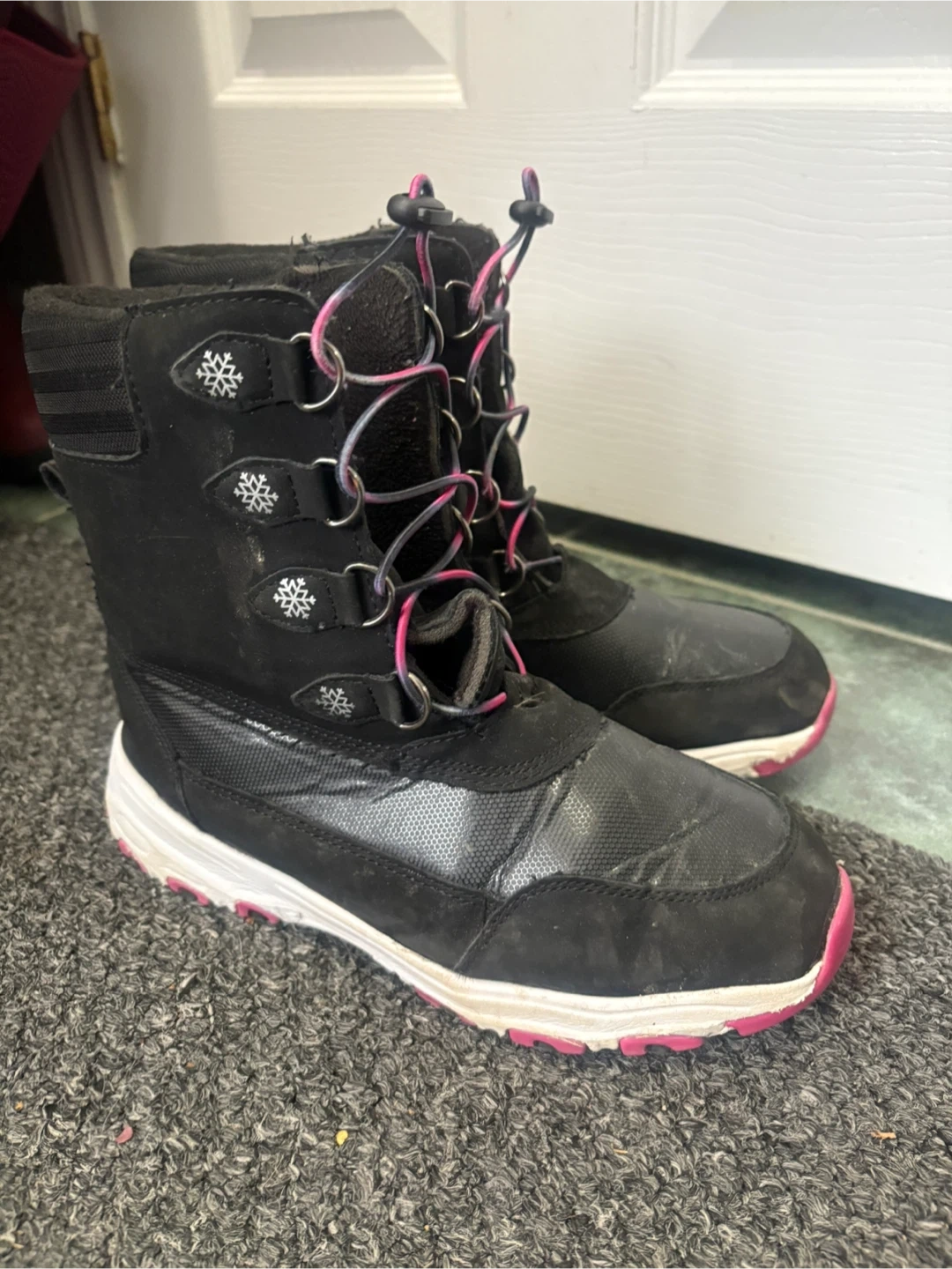 These black and pink winter boots are insulated and feature quick-lace closures. Durable sole for winter conditions.