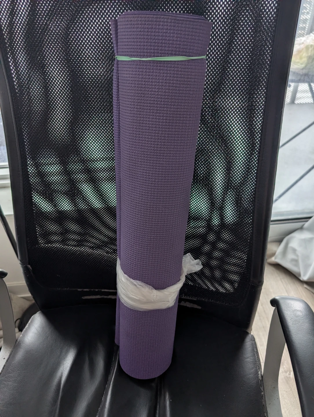 This is a standard yoga mat in a lovely purple colour. It's made from a durable foam material, offering good cushioning for your workouts. It rolls up easily for storage and transport.