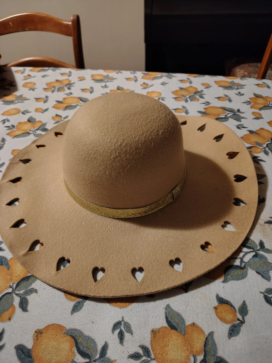 This stylish camel-coloured felt hat is from Limited Too. It features a decorative gold band and a brim with charming heart-shaped cutouts. Polyester material.