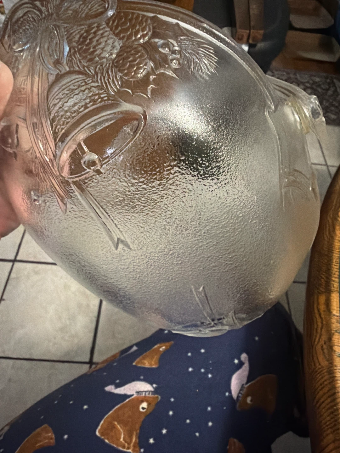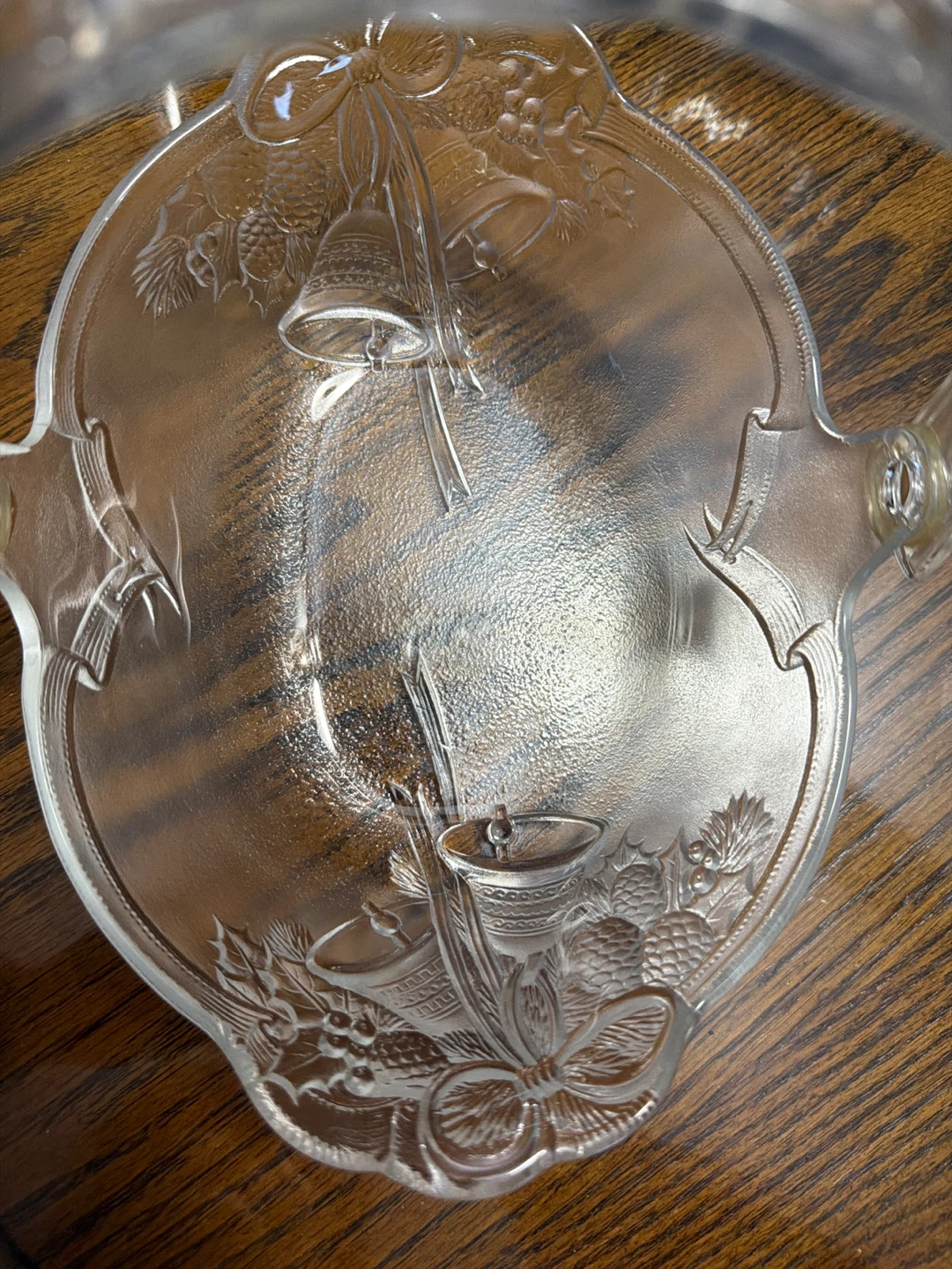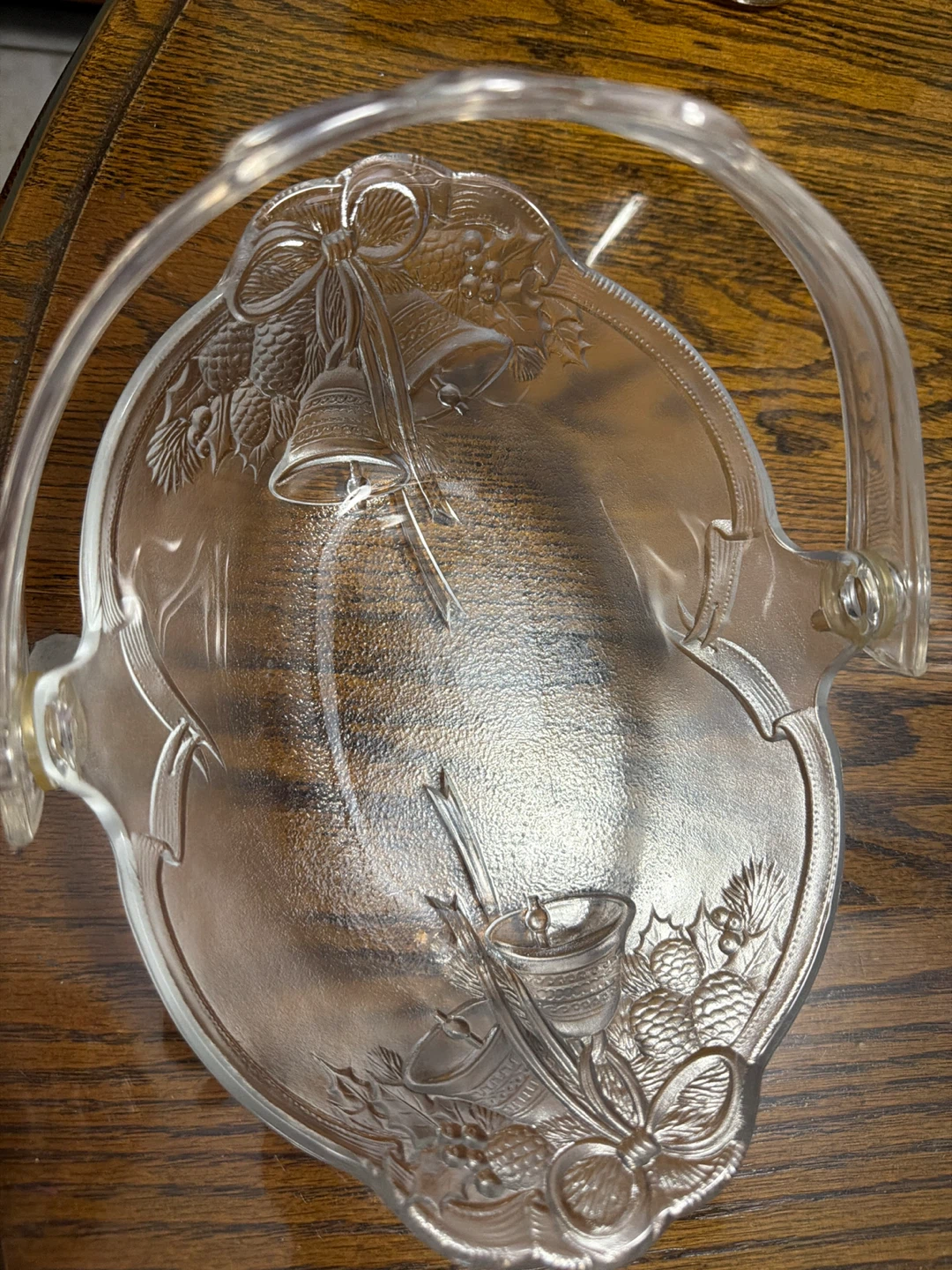 Selling a beautiful vintage glass serving bowl! It features an embossed design with bells, ribbons, and pinecones. Perfect for holiday gatherings or as a decorative piece! No box had in closet. Handle moves back n forth