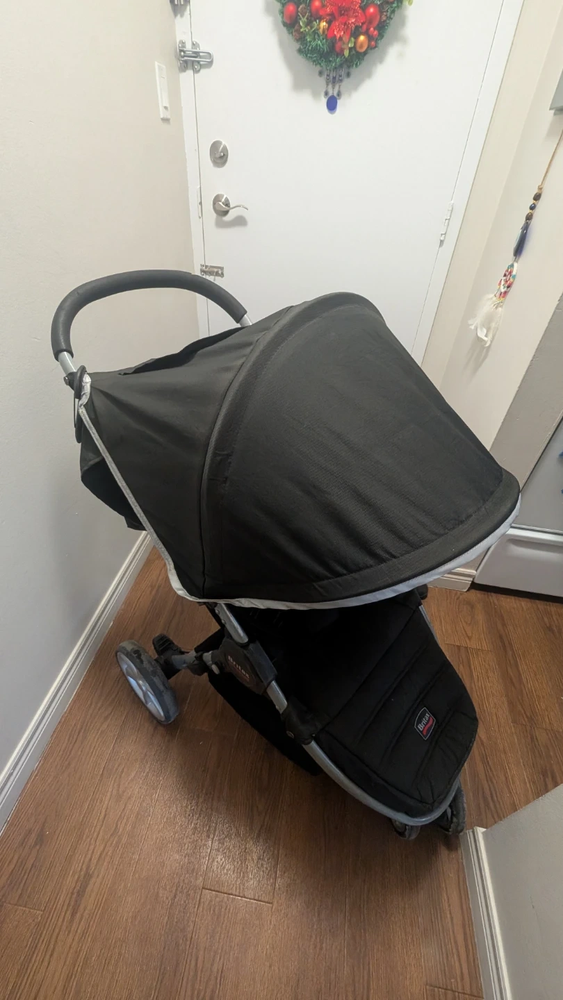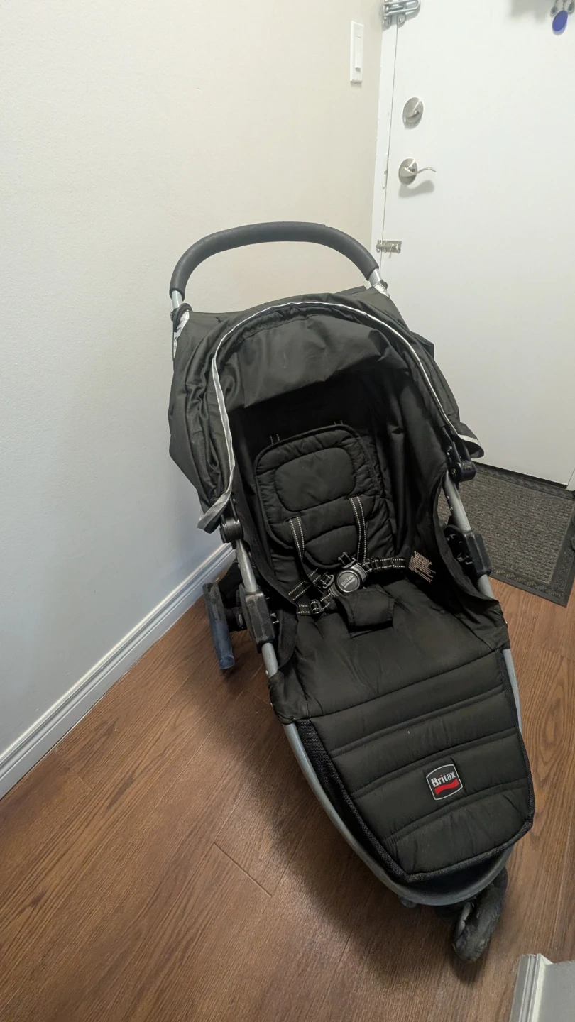 This is a black Britax stroller. It features a comfortable padded seat and an adjustable canopy. The stroller has a sturdy frame and smooth-rolling wheels.