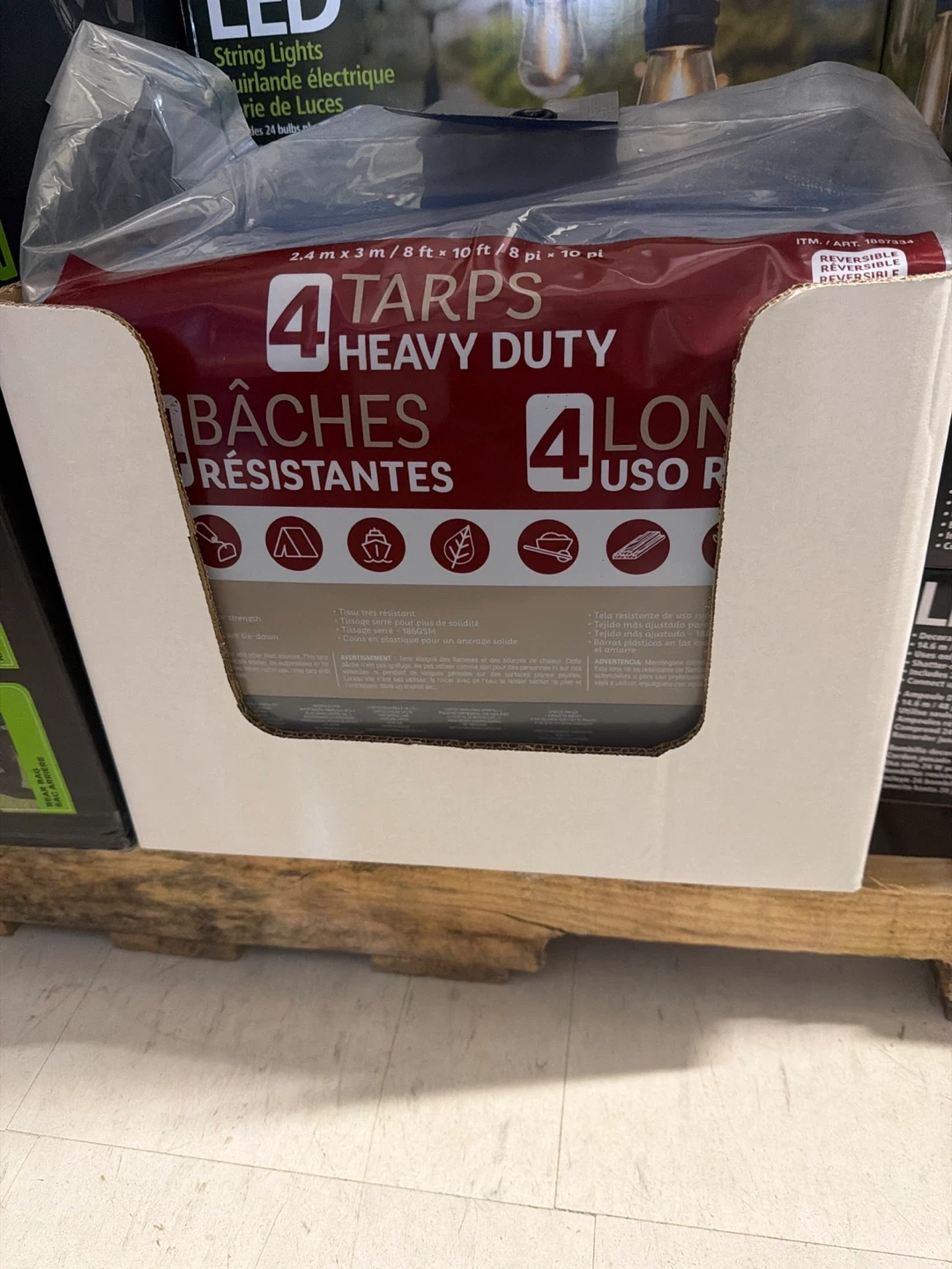 Four heavy duty tarps are included. Each tarp measures 2.4m x 3m (8ft x 10ft). These tarps are reversible and have a tight weave for added strength. Plastic corner grommets are included for anchoring.