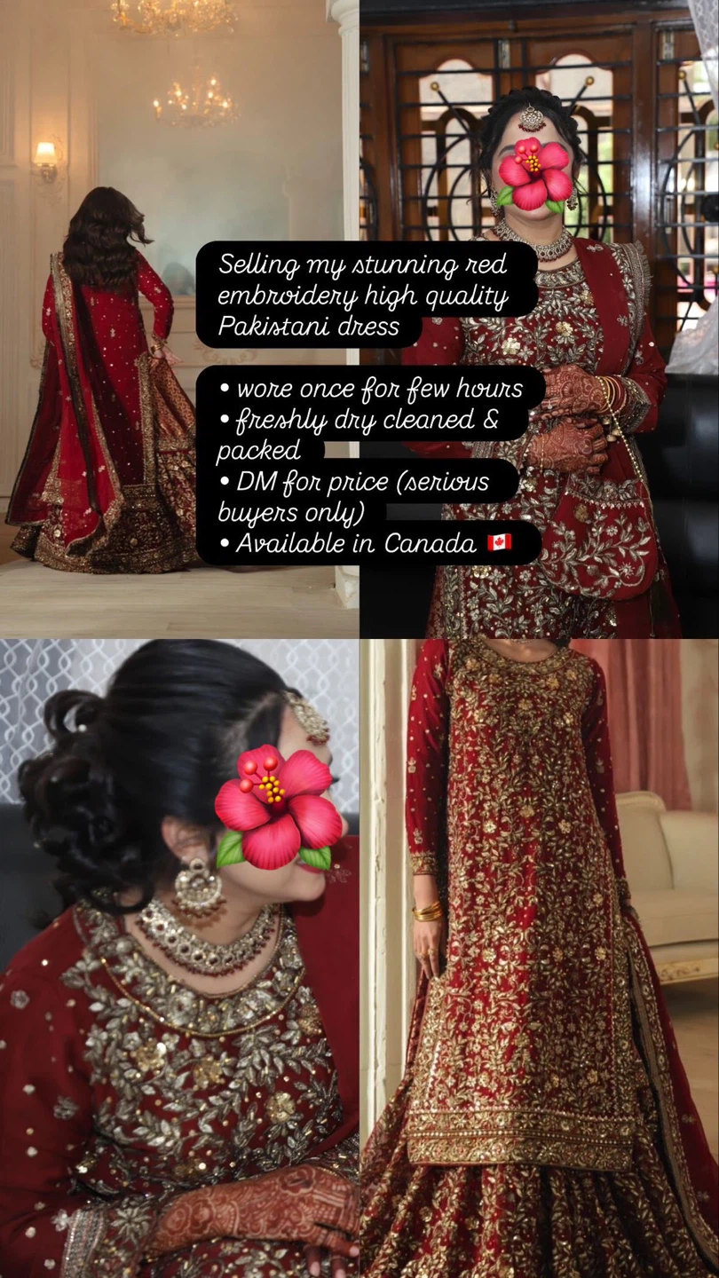 Selling my stunning red Pakistani dress, beautifully crafted with high-quality embroidery. It's been worn once for a few hours and is freshly dry-cleaned and packed. Available in Canada.