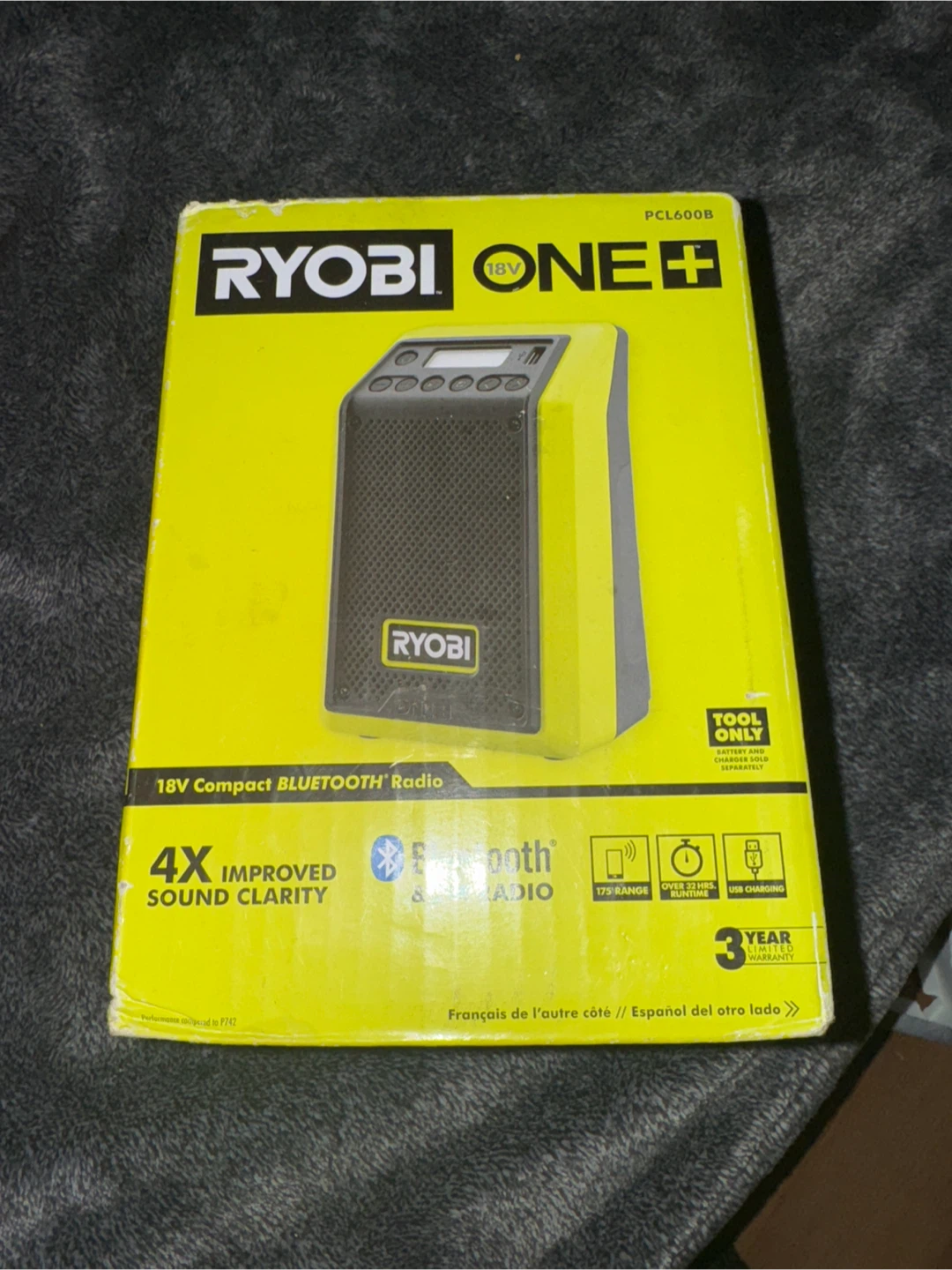 Selling a brand new Ryobi ONE+ 18V Compact Bluetooth Radio, model PCL600B. It's still in the original box! Enjoy 4x improved sound clarity with Bluetooth and FM radio. It has a 175' range and over 10 hours of runtime when charging.