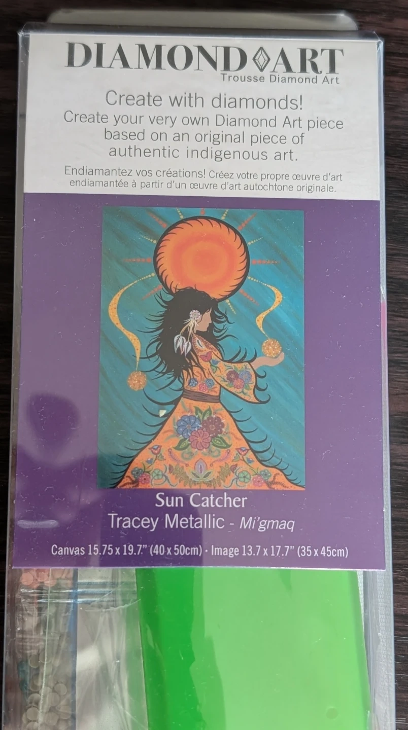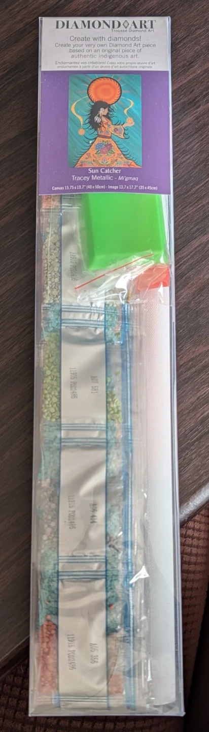 This Diamond Art kit includes one 15.75 x 19.7 inch canvas and diamond beads. It's based on original indigenous art by Tracey Metallic, Mi'gmaq. Create your own sparkling masterpiece!