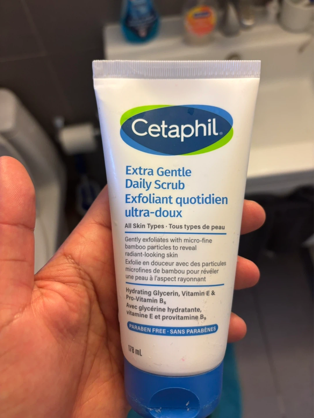 This Cetaphil Extra Gentle Daily Scrub comes in a 178 mL tube. It's formulated for all skin types and gently exfoliates with micro-fine bamboo particles. It contains hydrating Glycerin, Vitamin E, and Pro-Vitamin B5.