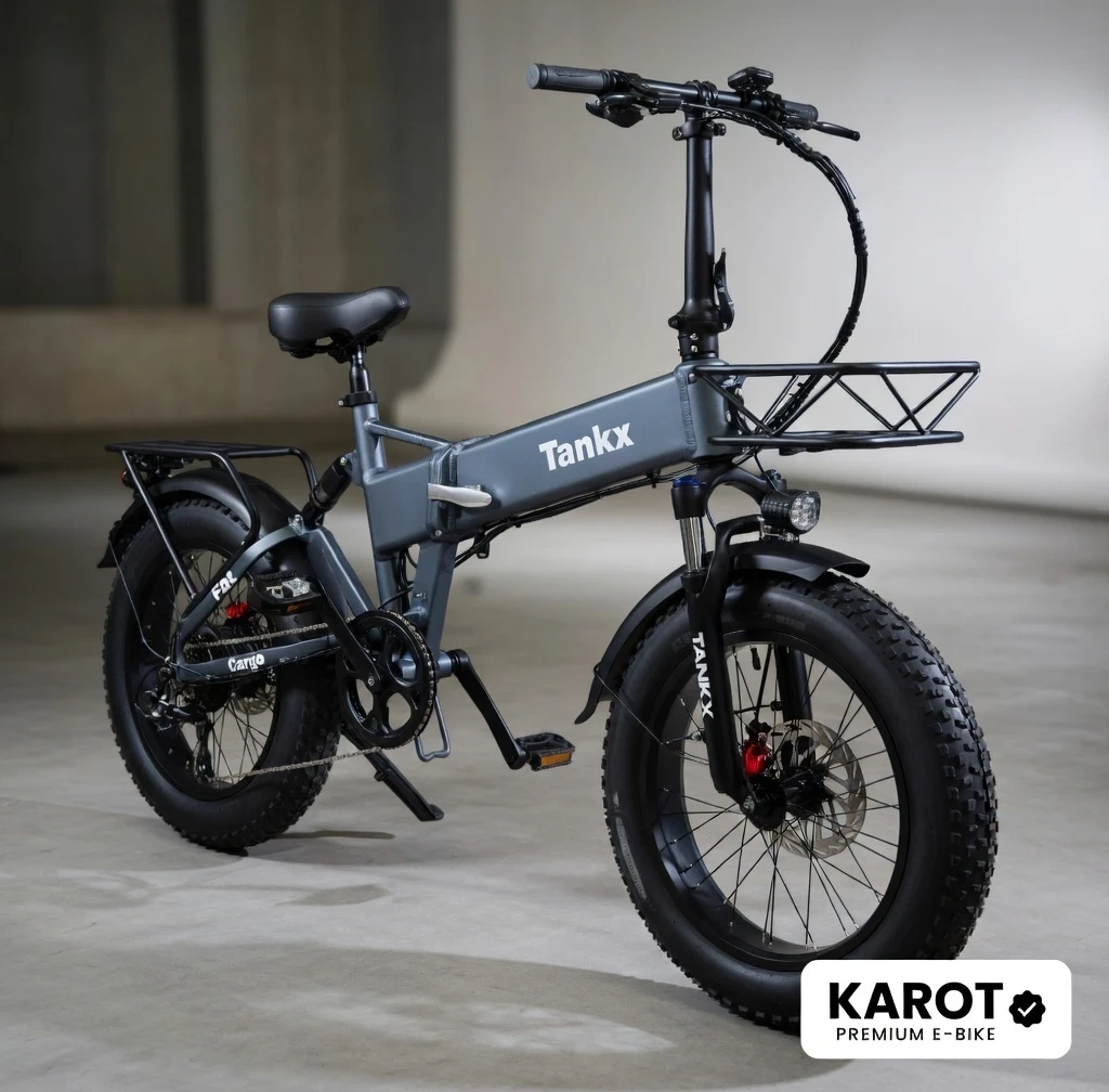 Tank X folding electric fat bike. It features a grey aluminium frame with fat tires and a front basket. It also has a rear rack for carrying cargo.