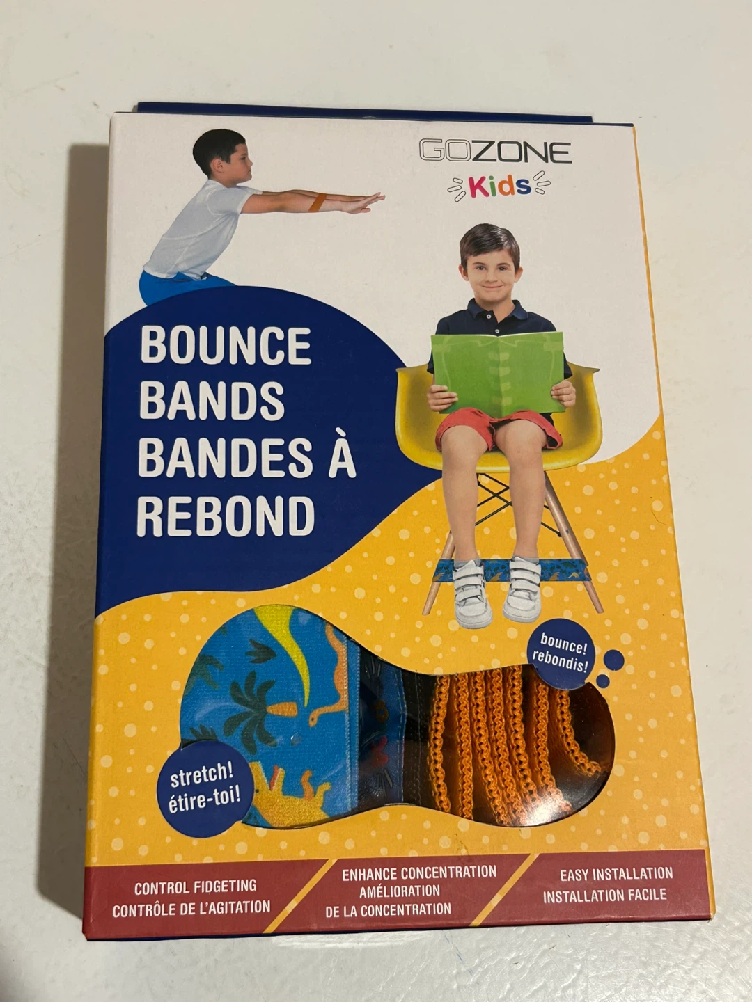 Brand new GoZone Kids Bounce Bands in the original box! These bands are designed to help kids enhance focus and concentration while controlling fidgeting. Easy to install and durable. Comes with 1 fabric power band and 1 fabric squat band.