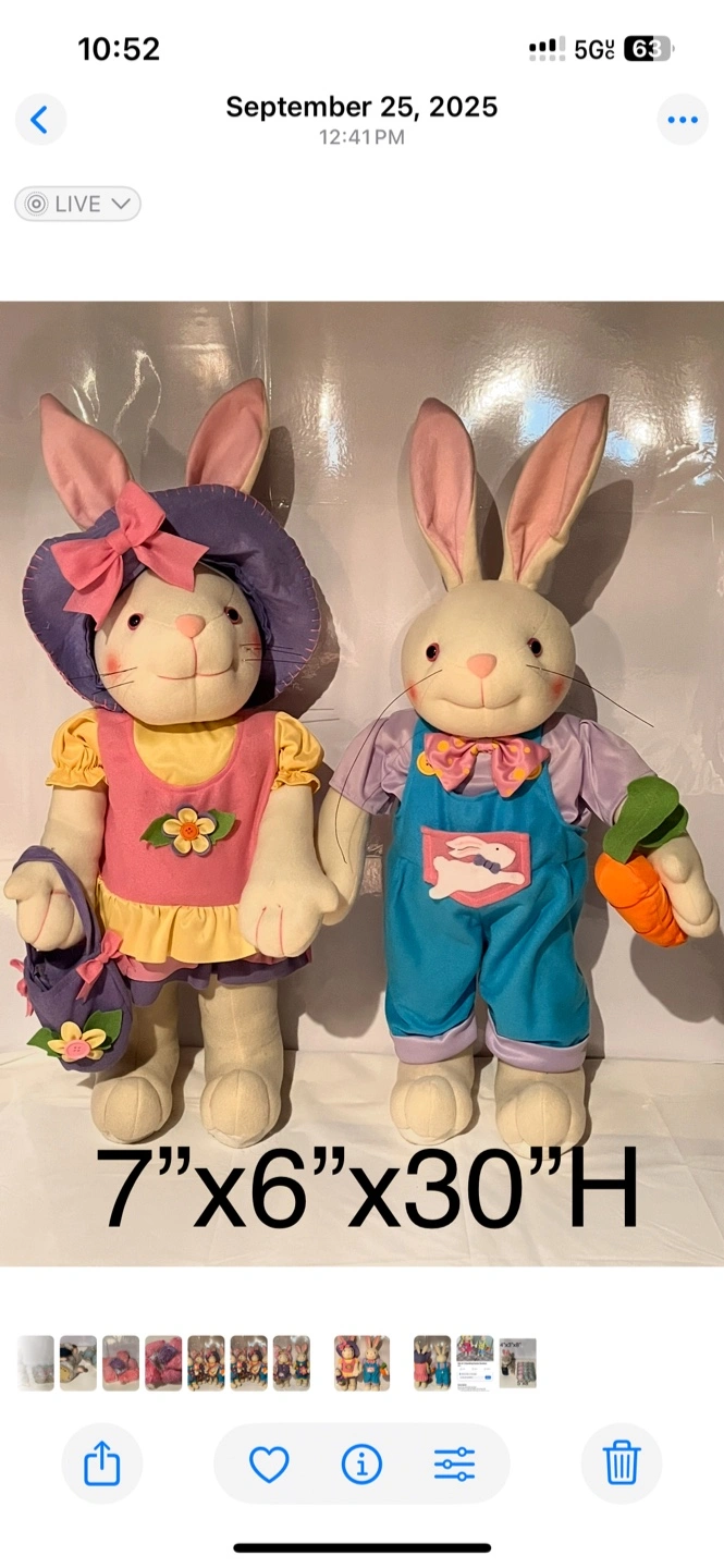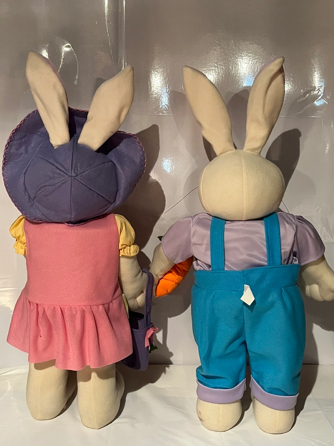 These adorable plush bunny figurines are perfect for Easter decor. One bunny wears a pink dress and purple hat, while the other wears blue overalls and carries a carrot. Each bunny is approximately 30 inches tall.